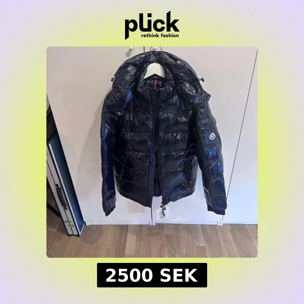 Snygg svart pufferjacka från Moncler med glansig yta och dragkedja. Jackan har en hög krage och långa ärmar, perfekt för kyliga dagar. Den har också en ikonisk Moncler-logga på ärmen. Väldigt populär jacka.
