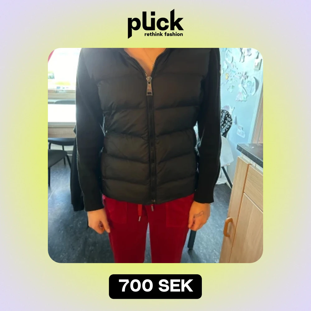 Moncler jacka med stickade ärmar. Reva på ena ärmen, går säkert att du snyggare så de inte syns. Min dotter är 153cm lång och har storlek XS. Kan skicka fler bilder.