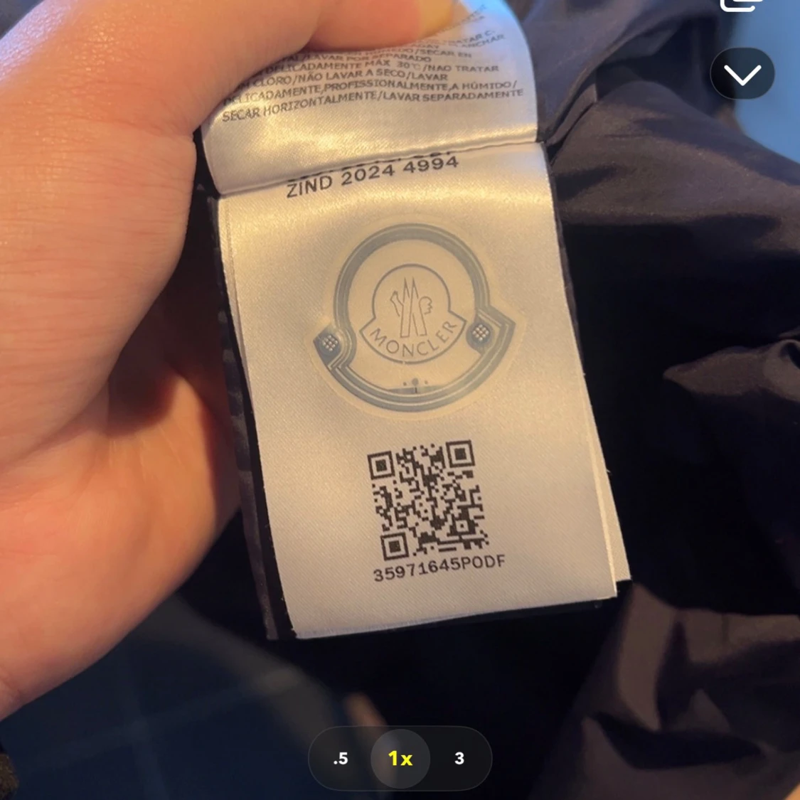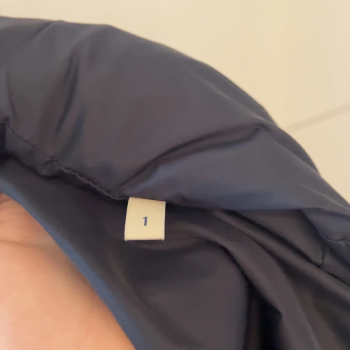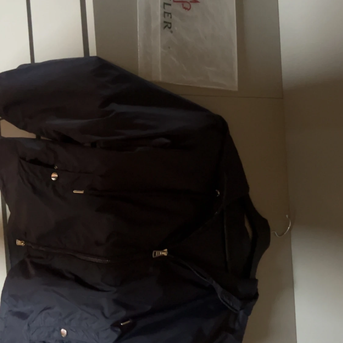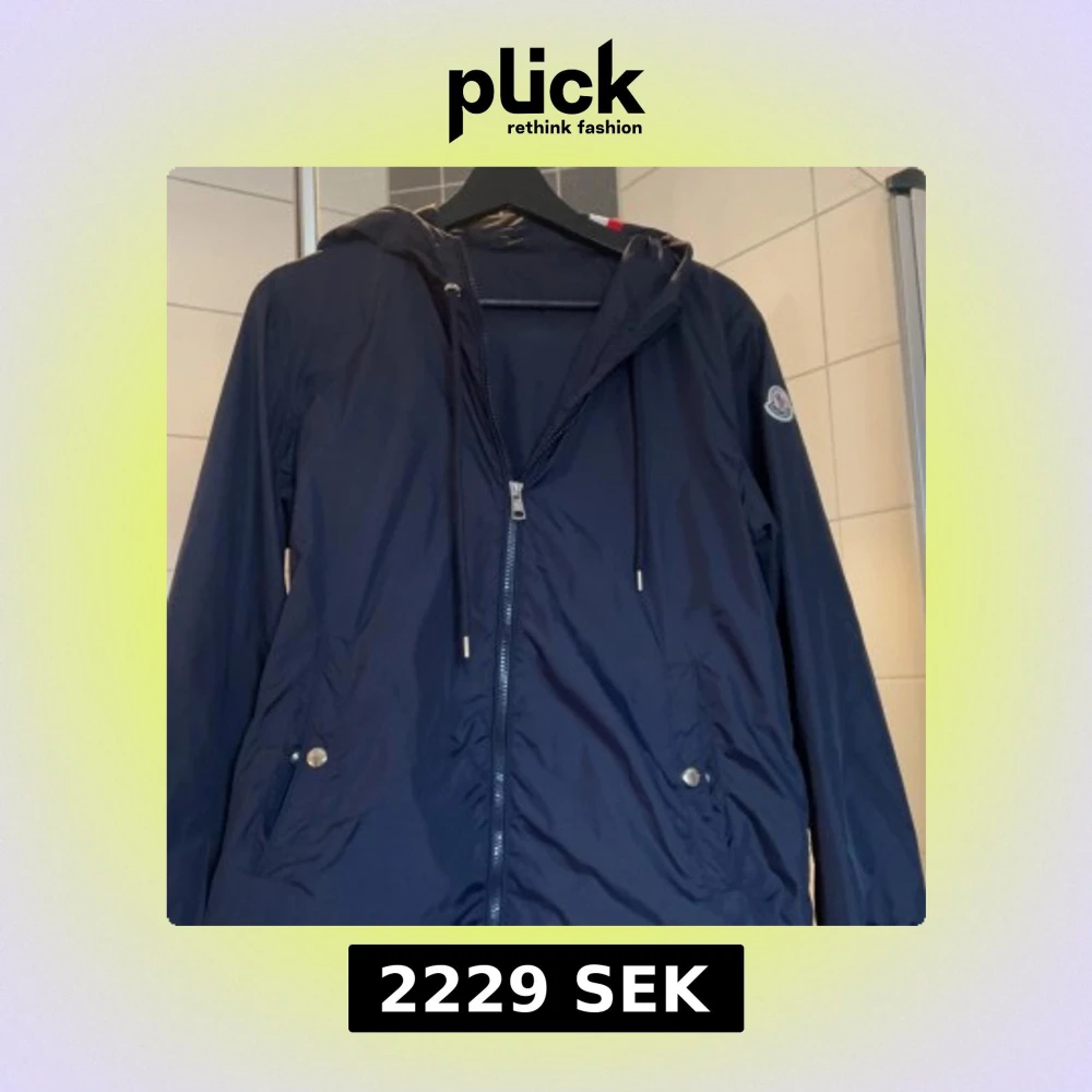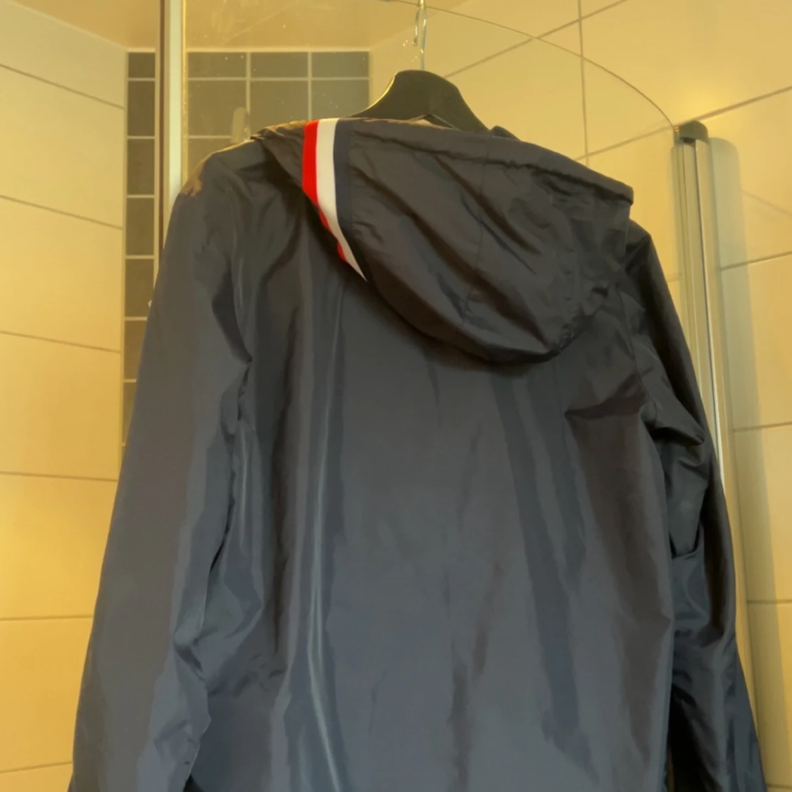 Mörkblå jacka från Moncler,har vit-röda ränder som en detalj på luvan.Storleken passar 160-175.för mer frågor och funderingar kontakta mig 😃