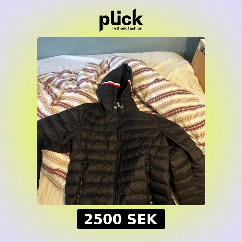 Säljer en svart Moncler dunjacka med huva och dragkedja. Jackan har Moncler-logga på ärmen och coola röda och vita detaljer på huvan. Priset kan diskuteras lite vid snabb affär. Storlek s/1 i Moncler