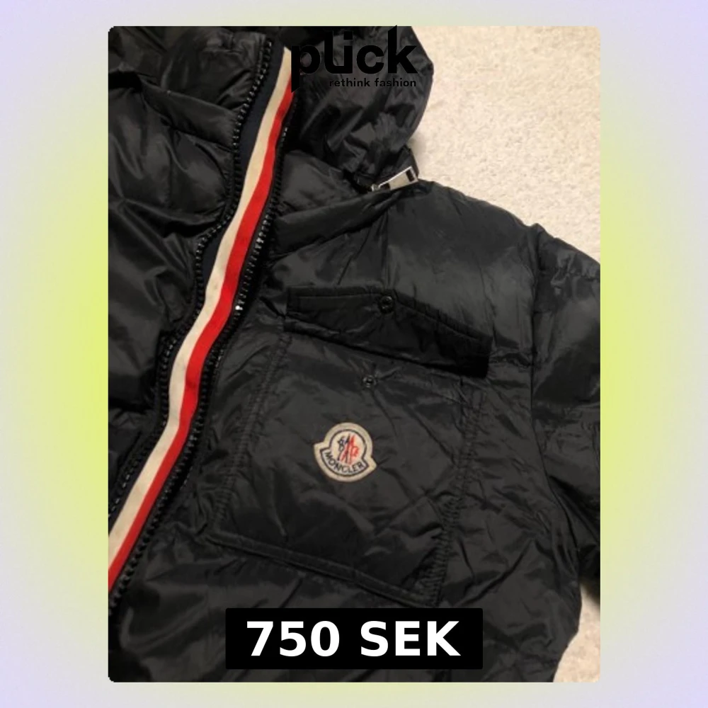 Svart dunjacka från Moncler med huva och coola detaljer som röd, vit och marinblå rand vid dragkedjan. Jackan har en bröstficka med Moncler-logga, innerficka med dragkedja och serietidningsmönster på insidan. Materialet är glansigt och jackan är quiltad för extra värme.