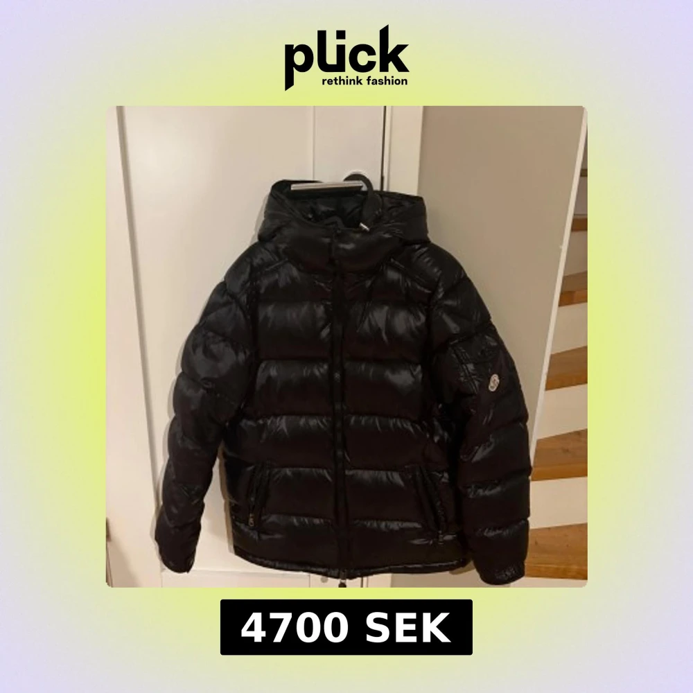 Moncler Maya - Säljer en svart, glansig pufferjacka från Moncler i storlek L. Jackan har huva, två sidofickor med dragkedja. Perfekt för dig som vill ha en varm och snygg jacka med street vibe och exklusiv känsla.