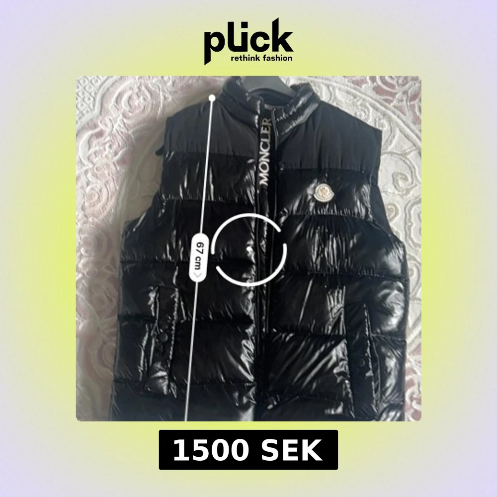 Snygg svart dunväst från Moncler med glansig finish och broderad logga på bröstet. Västen har hög krage, dragkedja framtill med Moncler-tryck och två fickor med knappar. Perfekt för lager-på-lager och streetstyle.