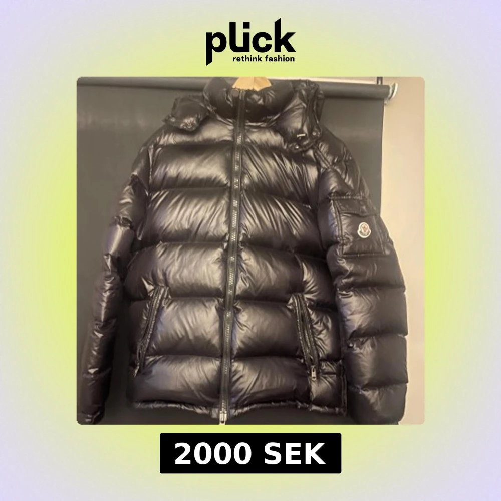 Säljer en svart dunjacka från Moncler med hög krage och huva. Jackan har dragkedja framtill, två snedställda fickor med dragkedja och Moncler-logga på ärmen. Insidan har ett serietidningsinspirerat tvättråd. Perfekt för kalla dagar och det är storleken 4 motsvarar L byten kan vara intressant