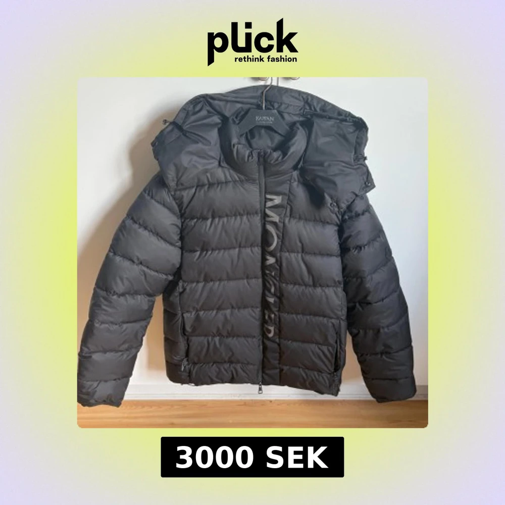 Säljer en svart pufferjacka från Moncler med huva och dragkedja framtill. Jackan har en klassisk quiltad design. Perfekt för kyliga dagar.