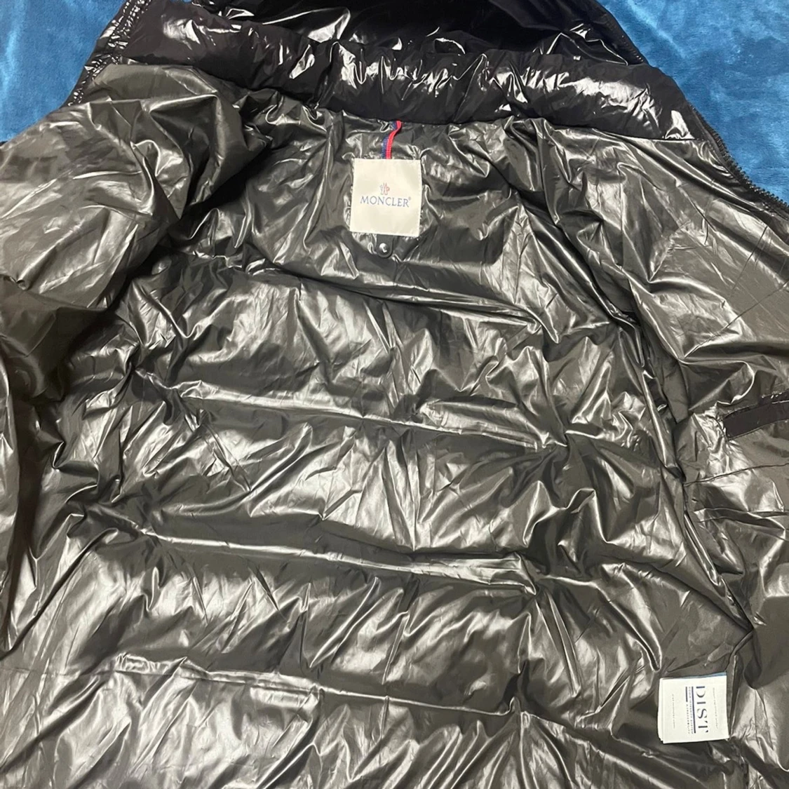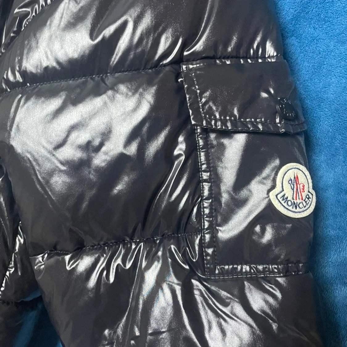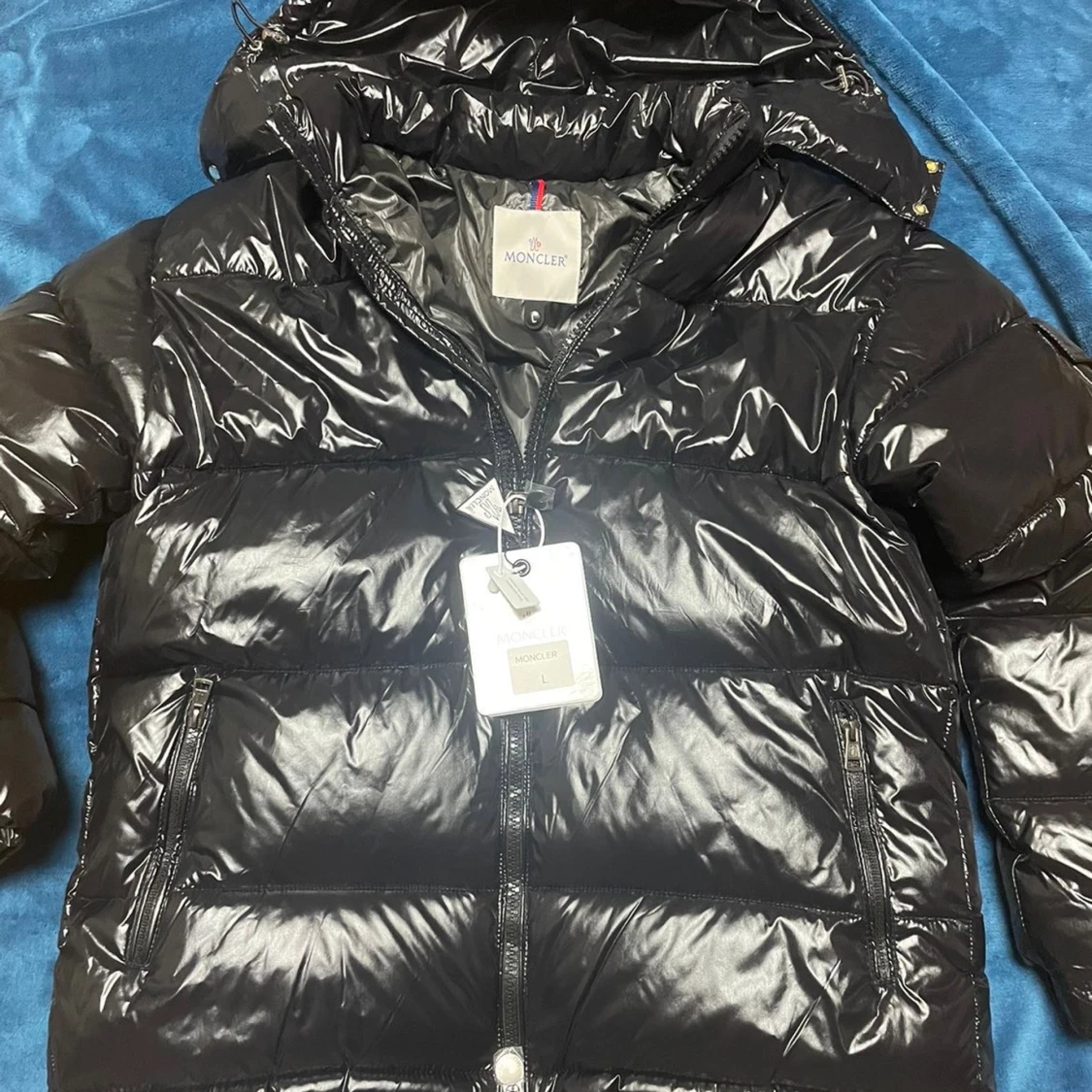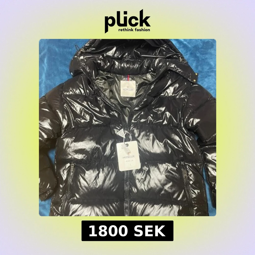 Säljer en svart, glansig pufferjacka från Moncler i storlek L. Jackan har huva, två sidofickor med dragkedja. Perfekt för dig som vill ha en varm och snygg jacka med street vibe och exklusiv känsla.