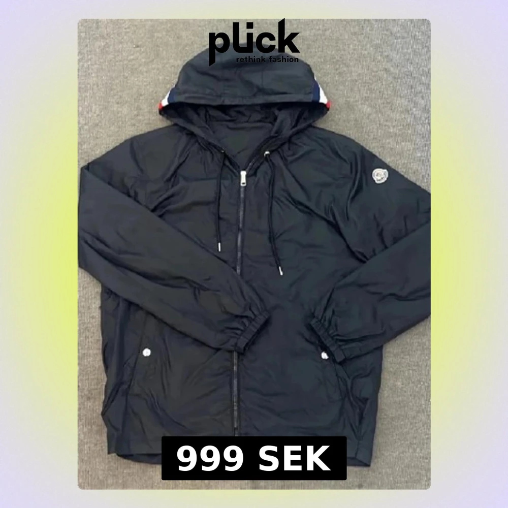 Svart vindjacka från Moncler med huva och snörning, hel dragkedja framtill och två fickor med tryckknappar. Jackan har Moncler-logga på ärmen och diskreta detaljer i rött, vitt och blått på huvan. Perfekt för dig som gillar stilrena och sportiga plagg. D ända är att dragkedjan gått sönder men den går ändå att knäppa och man ser ingeting att den e sönder