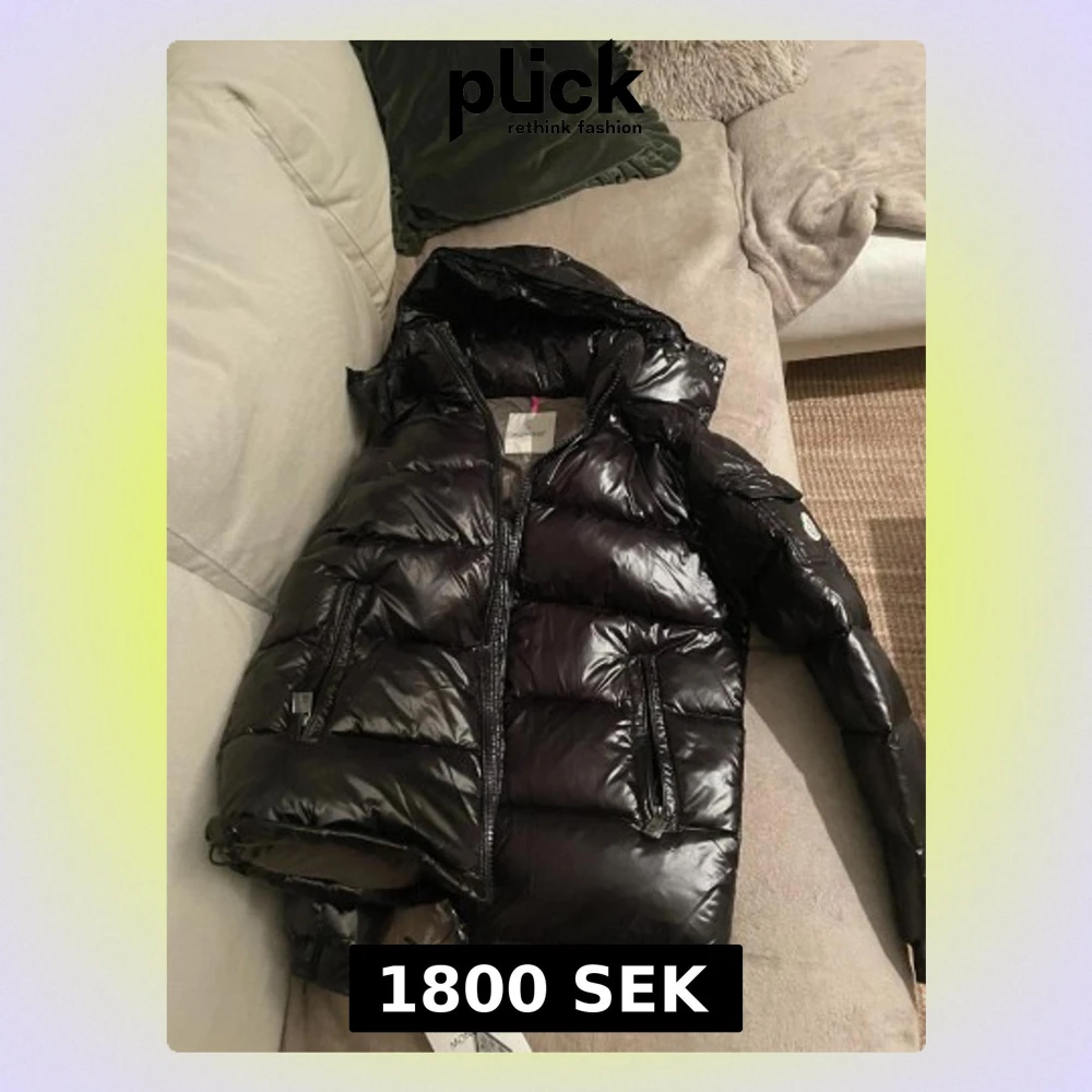 Säljer en svart, glansig pufferjacka från Moncler med huva och dragkedja framtill. Jackan har två fickor med dragkedja och en Moncler-logga på ärmen. Perfekt för kalla dagar och riktigt snygg streetstil.