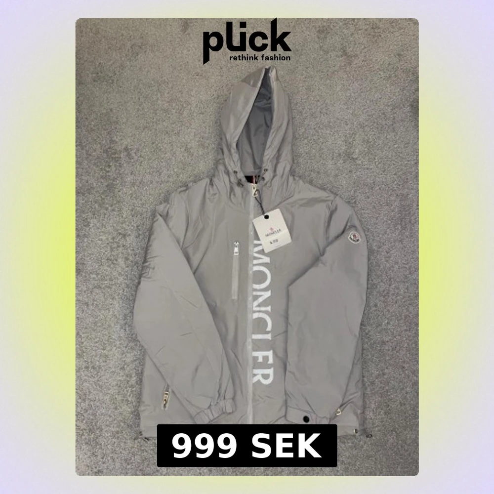 Snygg grå vindjacka från Moncler med stor logga på framsidan och klassisk patch på ärmen. Jackan har huva med snörning, dragkedja framtill och en bröstficka med zip. Materialet är lätt och syntetiskt, perfekt för blåsiga dagar.