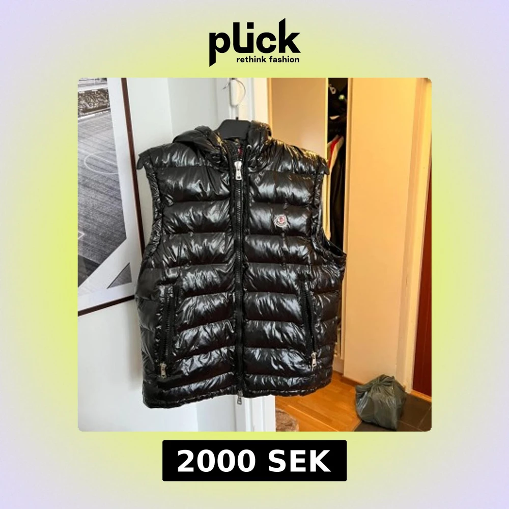 Snygg svart dunväst från Moncler med glansig finish och huva. Västen har dragkedja framtill, två fickor med dragkedja och Moncler-logga på bröstet. Perfekt för lager-på-lager och stilren look. Storlek L.