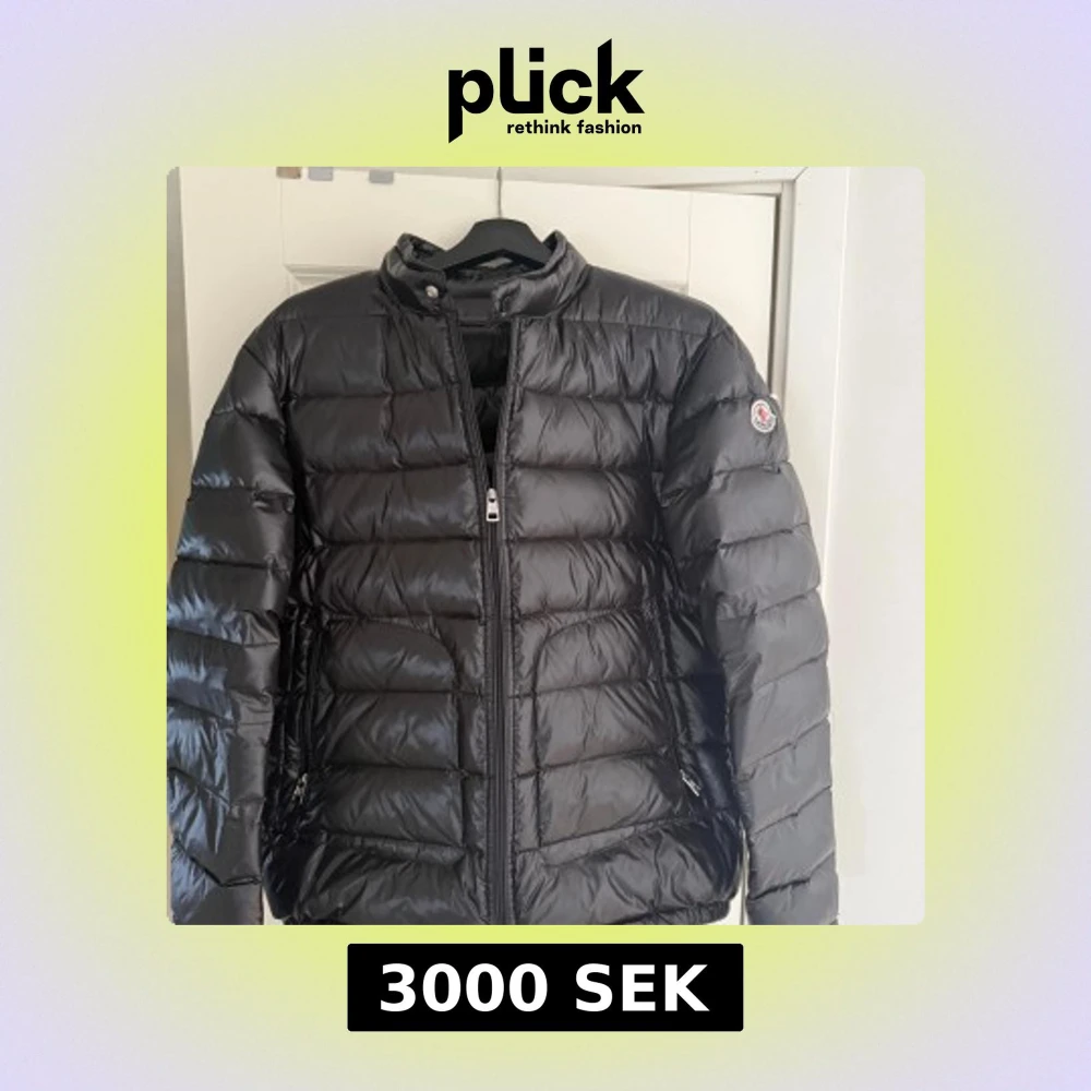 Säljer en stilren svart dunjacka från Moncler. Jackan har en quiltad design med dragkedja framtill och en hög krage. Perfekt för kyligare dagar med sin lätta och varma fyllning av vitt gåsdun. Köpt i andra hand men innan dess var den ny. Andvänd fåtal gånger bara! Skick är 9/10!