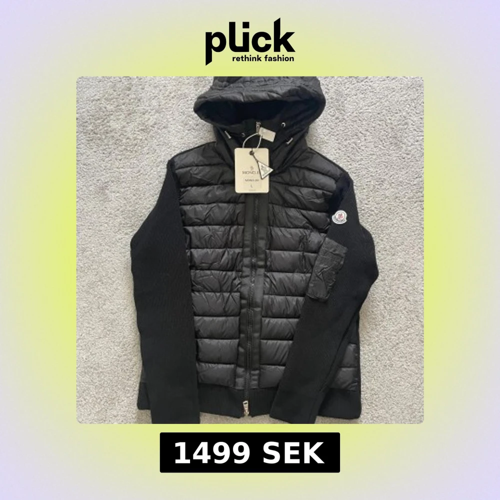 Svart cardigan från Moncler med stickade ärmar och quiltad front. Jackan har huva med snörning, dragkedja framtill och en ficka med dragkedja på ärmen. Moncler-logga på vänster ärm och coolt serietryck på insidan. Perfekt för dig som gillar street och premium. Den är i storlek L men passar i storlek M och S.