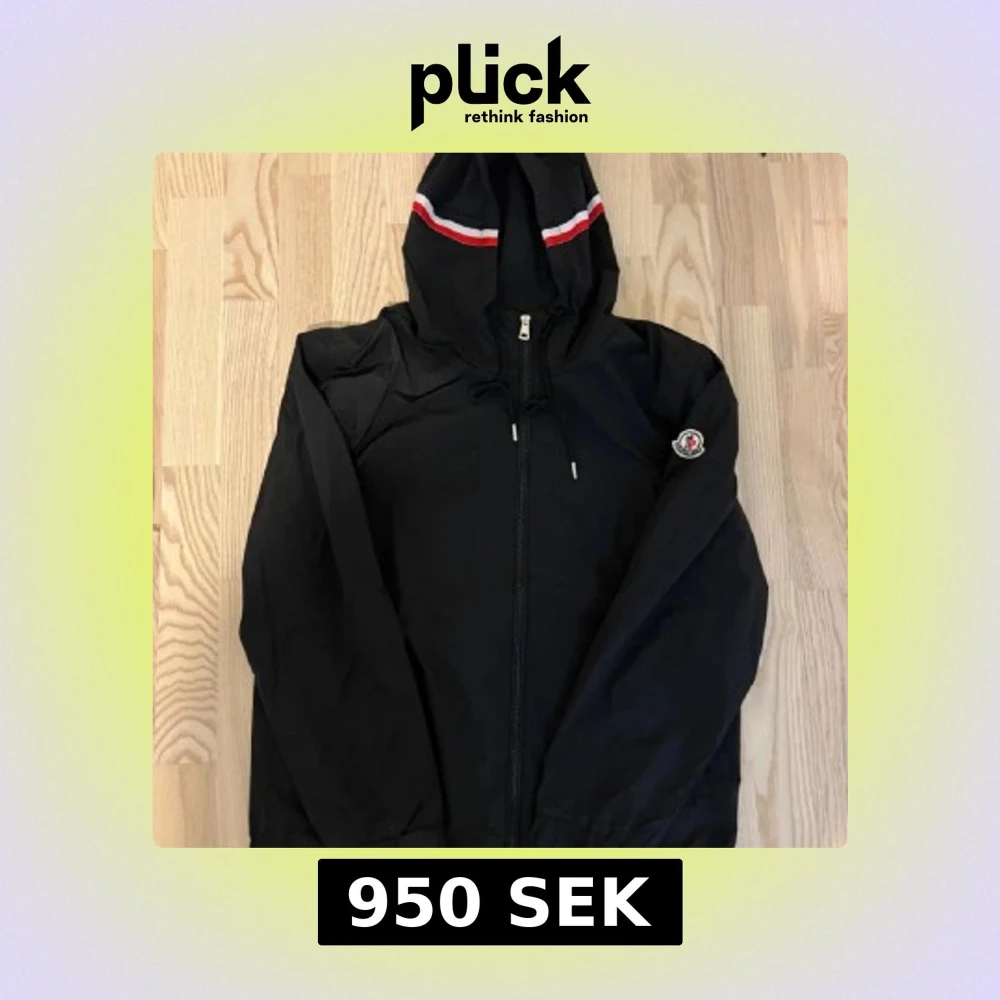 Svart vindjacka från Moncler med huva och snygga röda och vita ränder på toppen. Jackan har dragkedja framtill, snörning vid huvan och Moncler-logga på ärmen. Perfekt för dig som gillar stilrena och sportiga plagg.