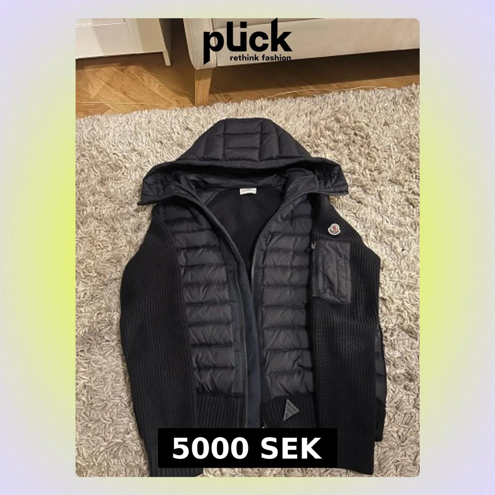 Svart pufferjacka från Moncler med stickade ärmar och quiltad front. Jackan har en stor huva, dragkedja framtill och Moncler-logga på ärmen. Materialmix av polyester och stickad ull ger en schysst kontrast. Perfekt för dig som gillar streetwear och vill ha något som sticker ut.