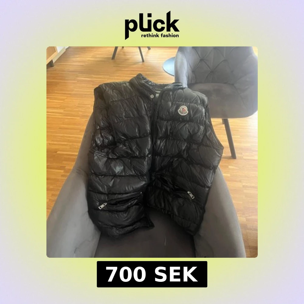 Snygg svart dunväst från Moncler med glansig finish och klassisk logga på bröstet. Västen har ståkrage, två fickor med dragkedja och quiltad design. Perfekt att slänga över en hoodie eller tröja när det är kyligt ute.