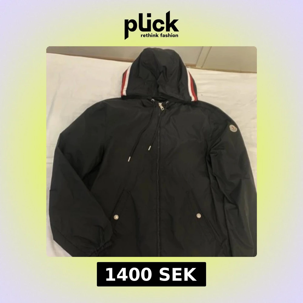 Svart vindjacka från Moncler med huva och dragkedja framtill. Jackan har Moncler-logga på ärmen. Nästan helt ny. Äkta såklart köpt på Plick. Sälja pågrund av att jag har bytt stil så har inte behov av den längre