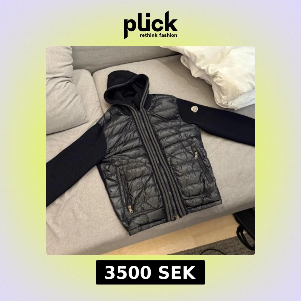 Säljer en svart cardigan jacka från Moncler i storlek L men passar L/M, quiltad front i syntet och stickade ärmar och huva. Jackan har dragkedja framtill, två fickor med dragkedja och Moncler-logga på ärmen. Perfekt för dig som vill ha en snygg och sportig look. Äktighetsbevis på bilderna. Priset är inte hugget i sten👍🏼.