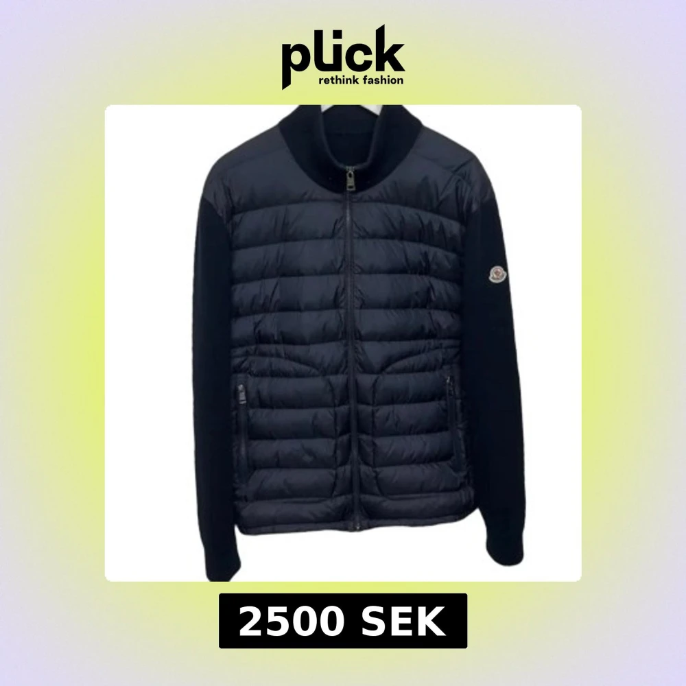 Snygg svart pufferjacka från Moncler med quiltad framsida och stickade ärmar. Jackan har hög krage, två fickor med dragkedja och Moncler-logga på ärmen. Perfekt för dig som vill ha en stilren och exklusiv look under kyliga dagar. Liten i storlek!!!!!!