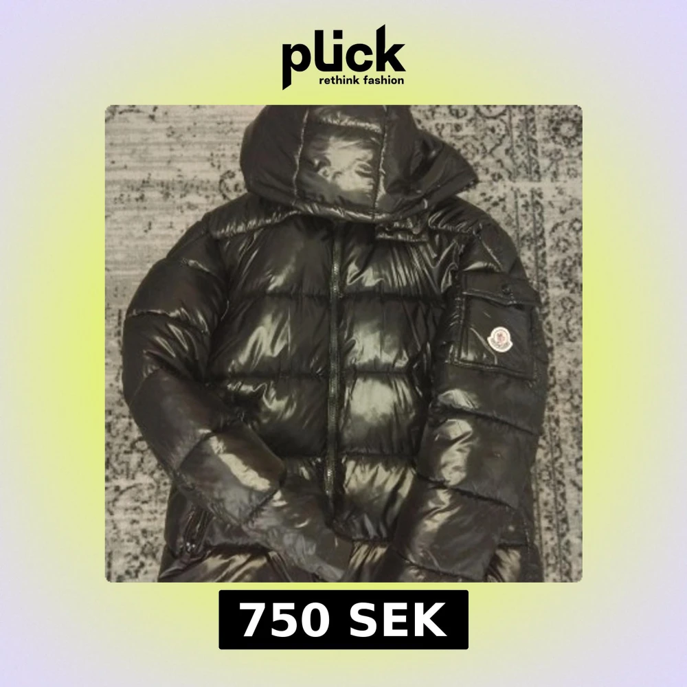 Säljer en svart, glansig dunjacka från Moncler med huva och dragkedja framtill. Jackan har en ficka med Moncler-logga på ärmen och quiltad design. Perfekt för kalla dagar och riktigt snygg streetstil.
