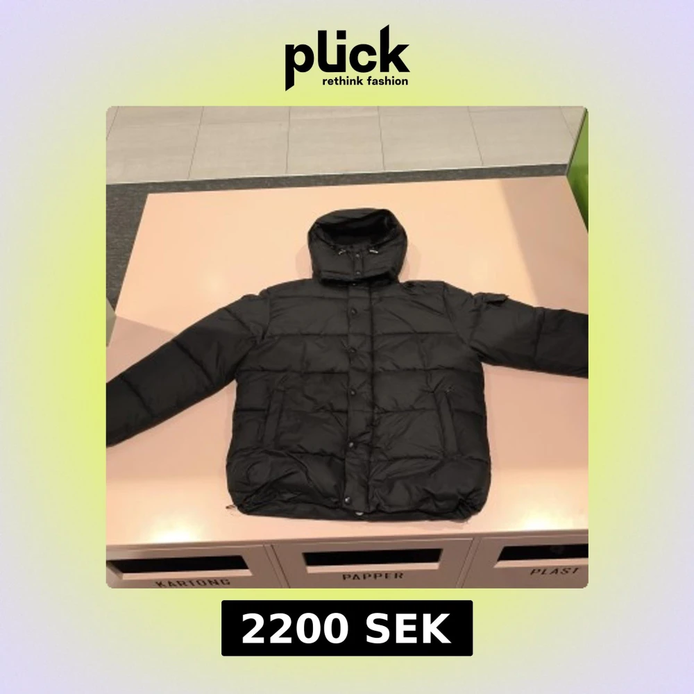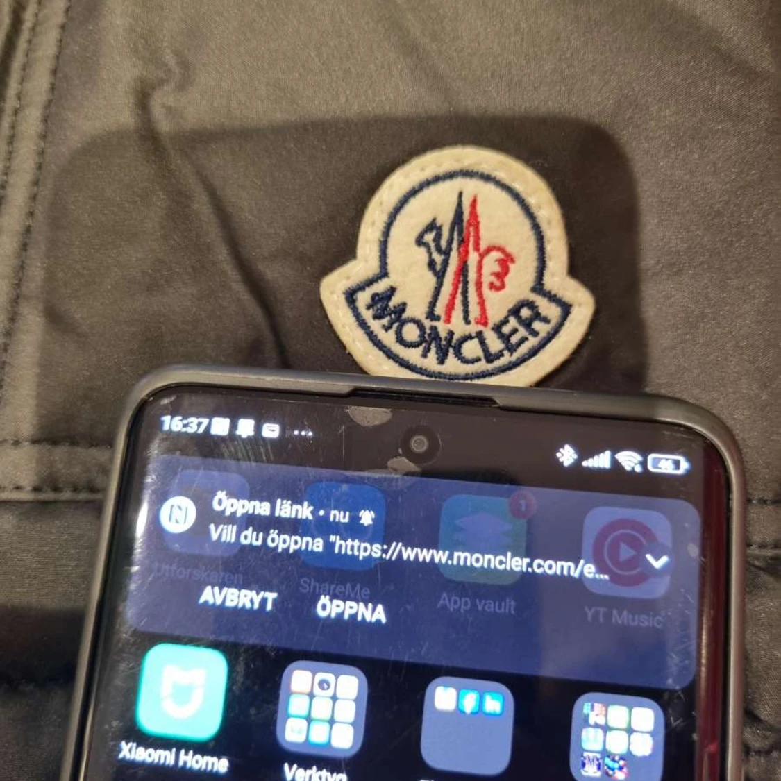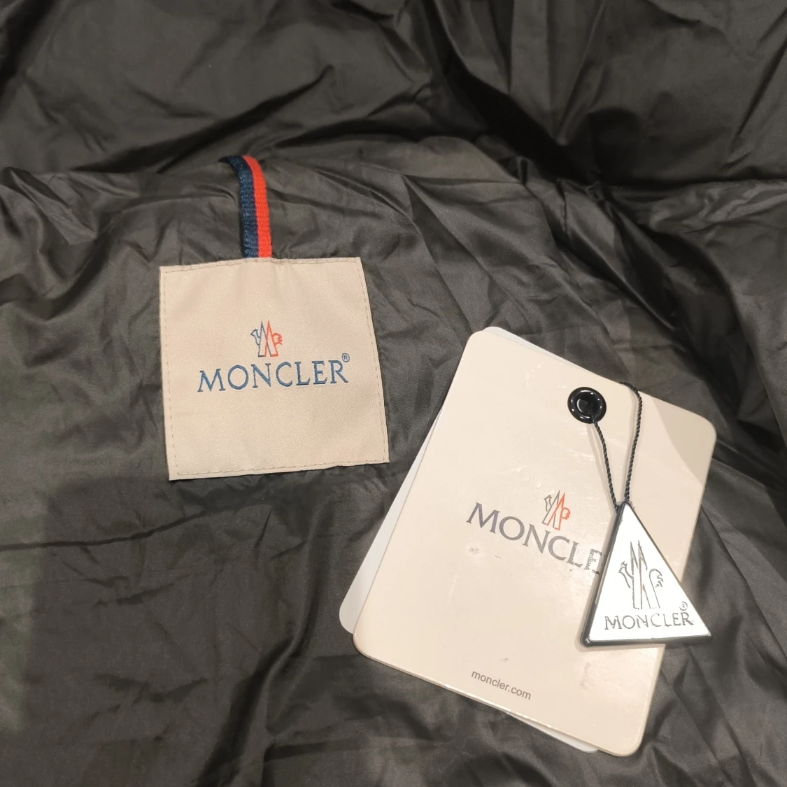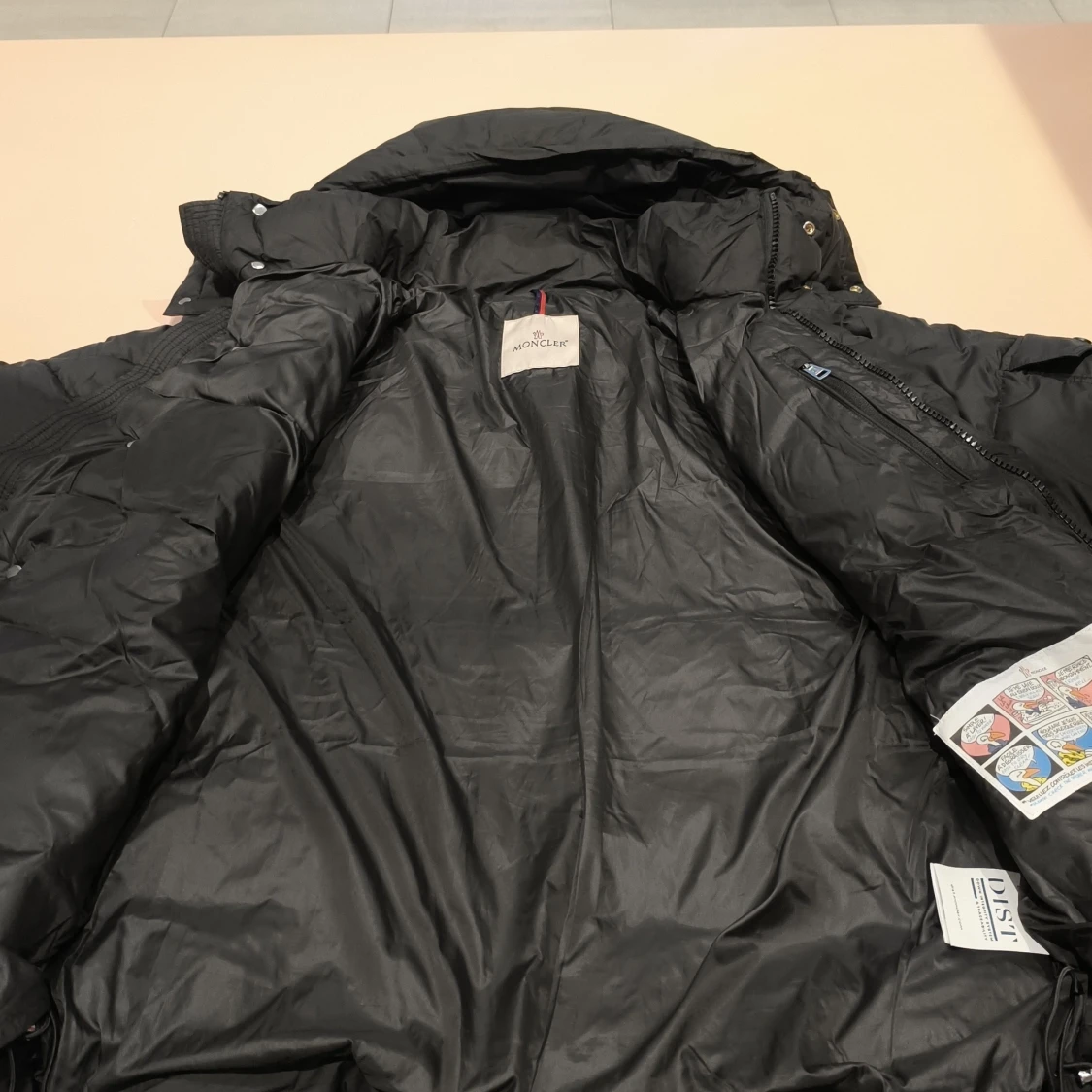 Svart dunjacka från Moncler med hög krage och huva. Jackan har quiltad design, dragkedja och knappar framtill samt praktiska fickor. Insidan har Moncler-etikett och serietypisk serietidningslapp. Perfekt för kalla dagar.