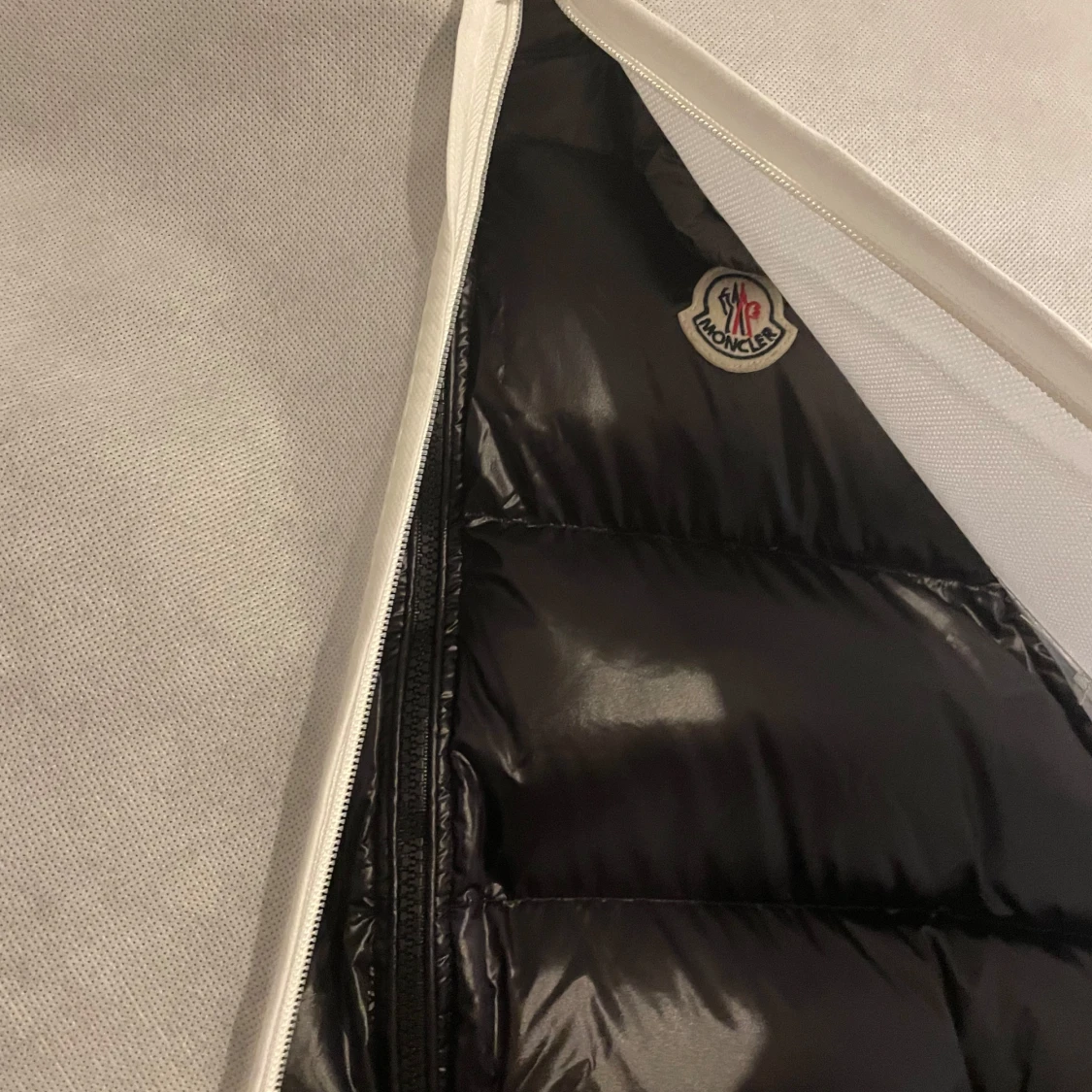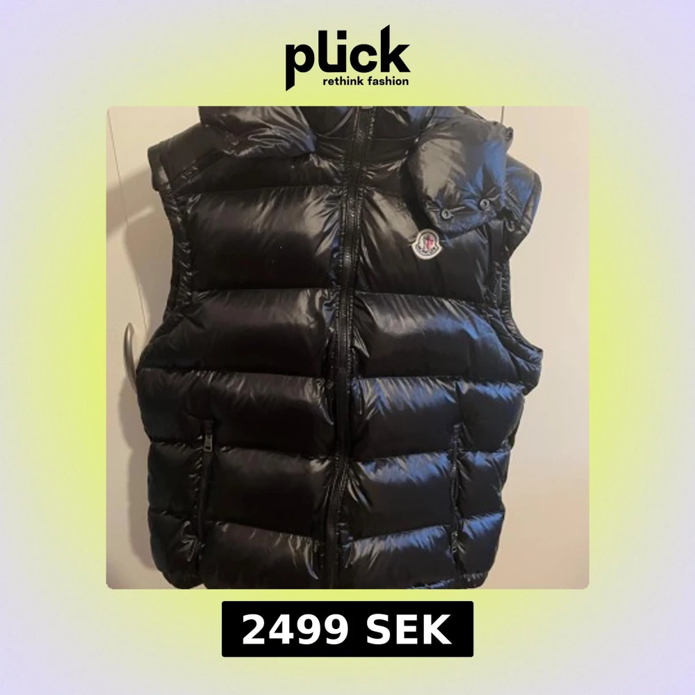 Snygg svart dunväst från Moncler med dragkedja och hög krage. Perfekt för kyliga dagar när du vill hålla stilen. Västen har Monclers ikoniska logga på bröstet och kommer med en praktisk förvaringspåse.