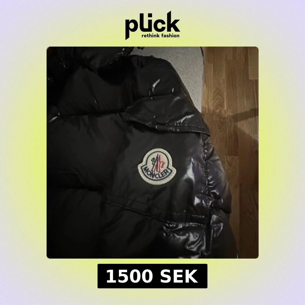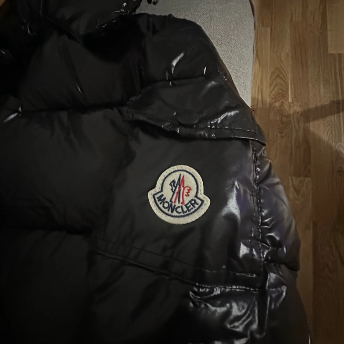 Säljer en svart, glansig pufferjacka från Moncler med klassisk logga på ärmen. Jackan har dragkedja framtill, hög krage och stora vadderade sektioner. Perfekt för kalla dagar och riktigt snygg streetstil.