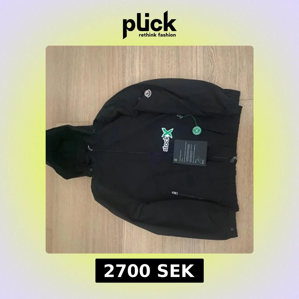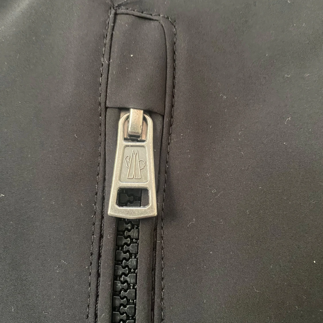 Svart vindjacka från Moncler med huva och hel dragkedja framtill. Jackan har klassisk Moncler-logga på ärmen och stilren design. Materialet är lätt och passar perfekt för blåsiga dagar. Snygg och enkel att matcha med streetwear eller casual outfits.