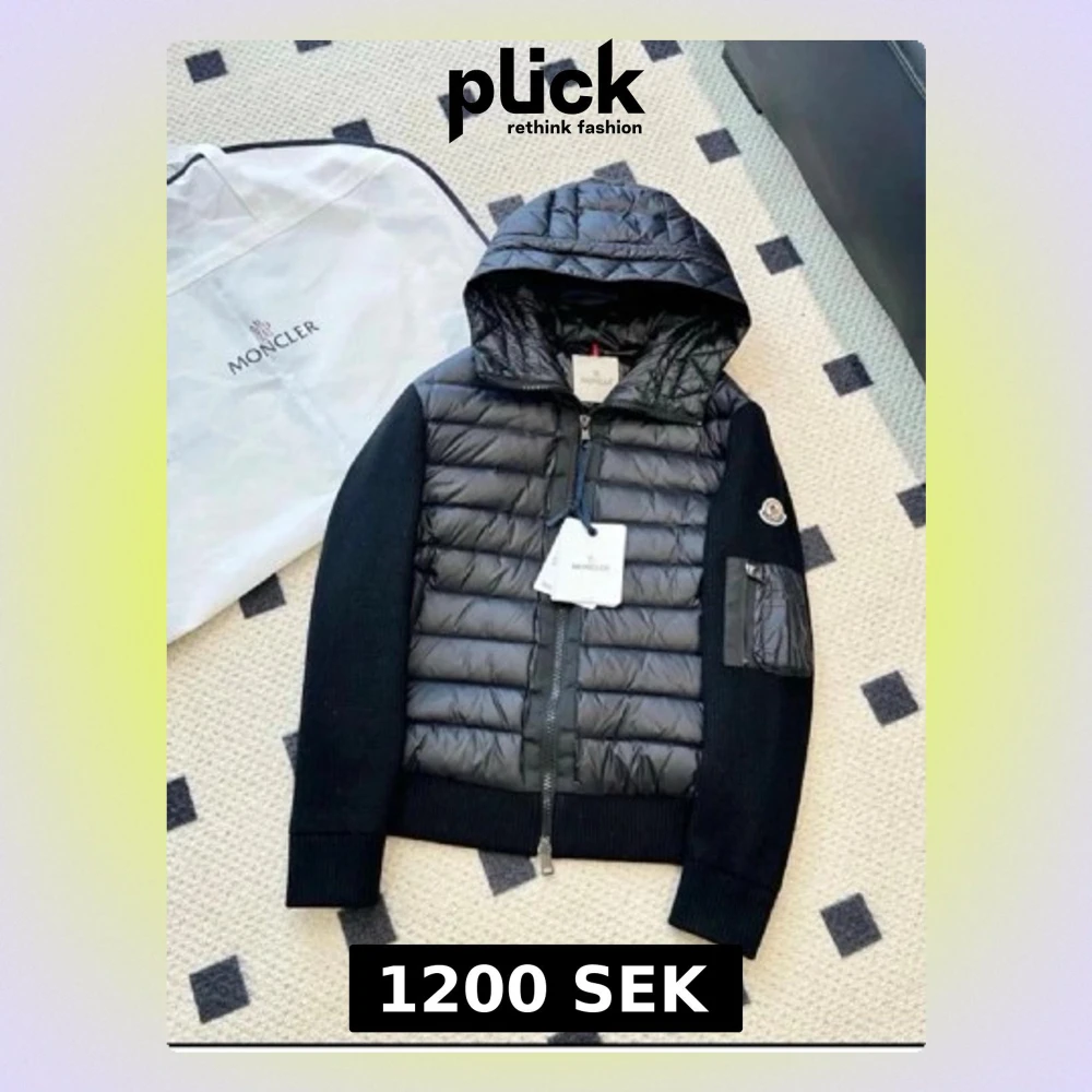 Säljer en svart pufferjacka från Moncler med huva och ribbade stickade ärmar. Jackan har quiltad front, dragkedja och en ficka med Moncler-logga på ärmen. Perfekt för dig som vill ha en stilren och exklusiv look.