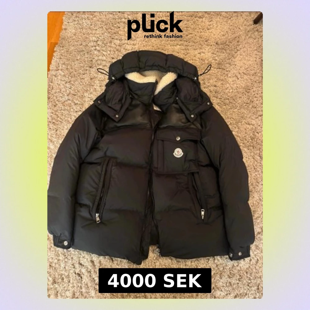 Säljer en svart pufferjacka från Moncler med stor huva och mysigt teddyfoder. Jackan har flera praktiska fickor med dragkedja och en bröstficka med Moncler-logga. Perfekt för kalla dagar med sin tjocka och fluffiga design. Stockholm, möts eller postar!