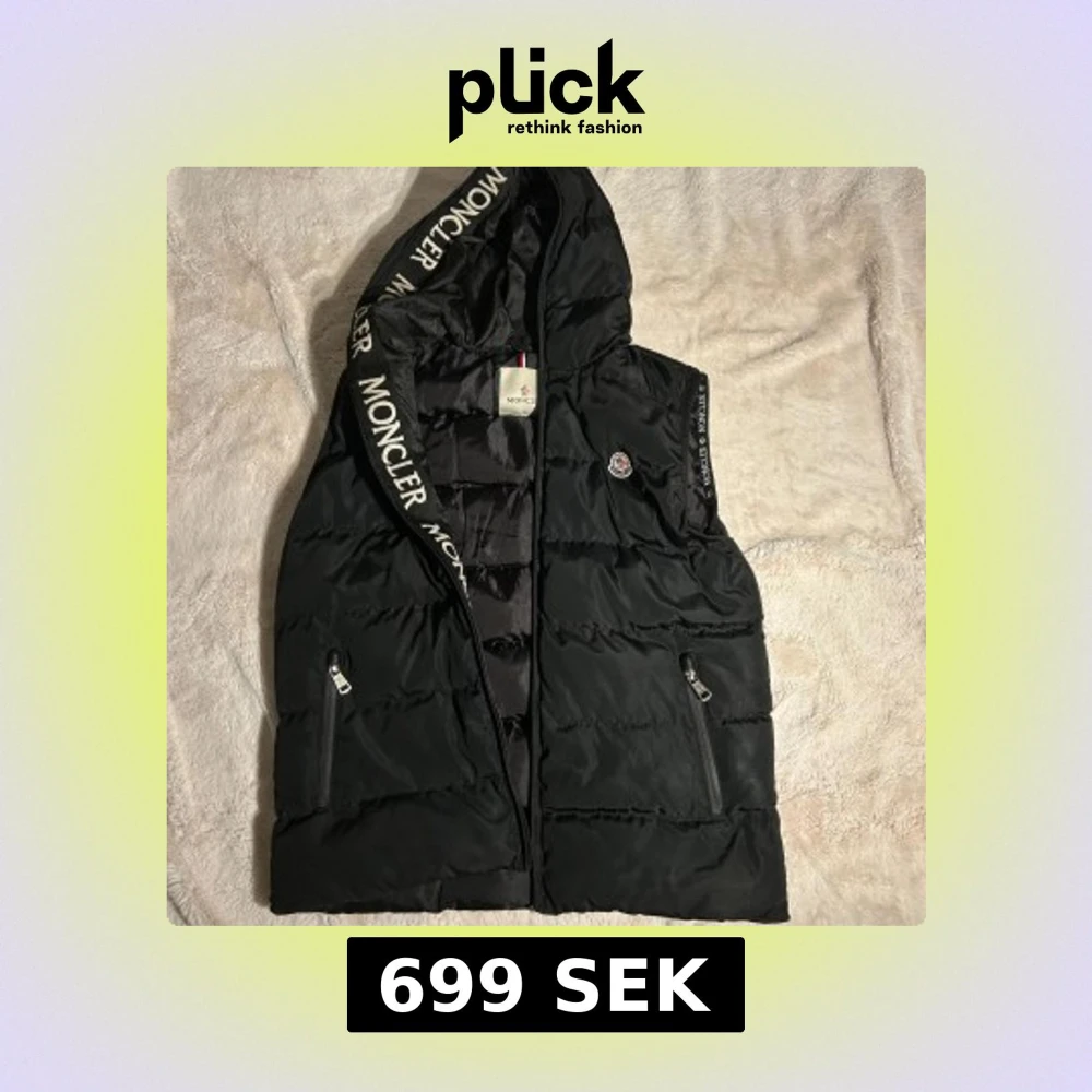 Svart dunväst från Moncler med stor huva och tydlig logga på huvkanten. Storlek M. ✅skriv för frågor, mått eller mer bilder ✅. Dragkedjan är trasig och den finns ett litet håll på baksidan , inget som inte går att fixa 👍.