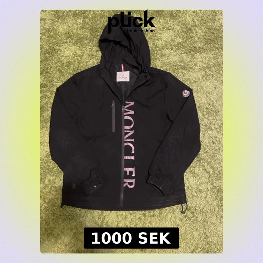 Svart vindjacka från Moncler med stor logga i rosa längs dragkedjan. Jackan har huva, tre framfickor med dragkedja och Moncler-märke på ärmen. Snygg och stilren design med elastiska muddar och justerbar nederkant.