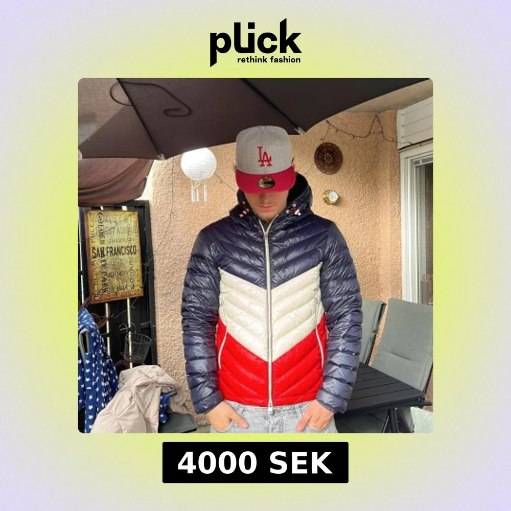 Snygg dunjacka från Moncler med coolt färgblock i mörkblått, vitt och rött. Jackan har huva med snörning, två dragkedjefickor och quiltad design. Perfekt för dig som vill sticka ut med en sportig och modern look. Passar dig som gillar streetstyle.