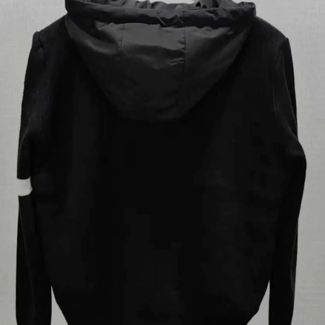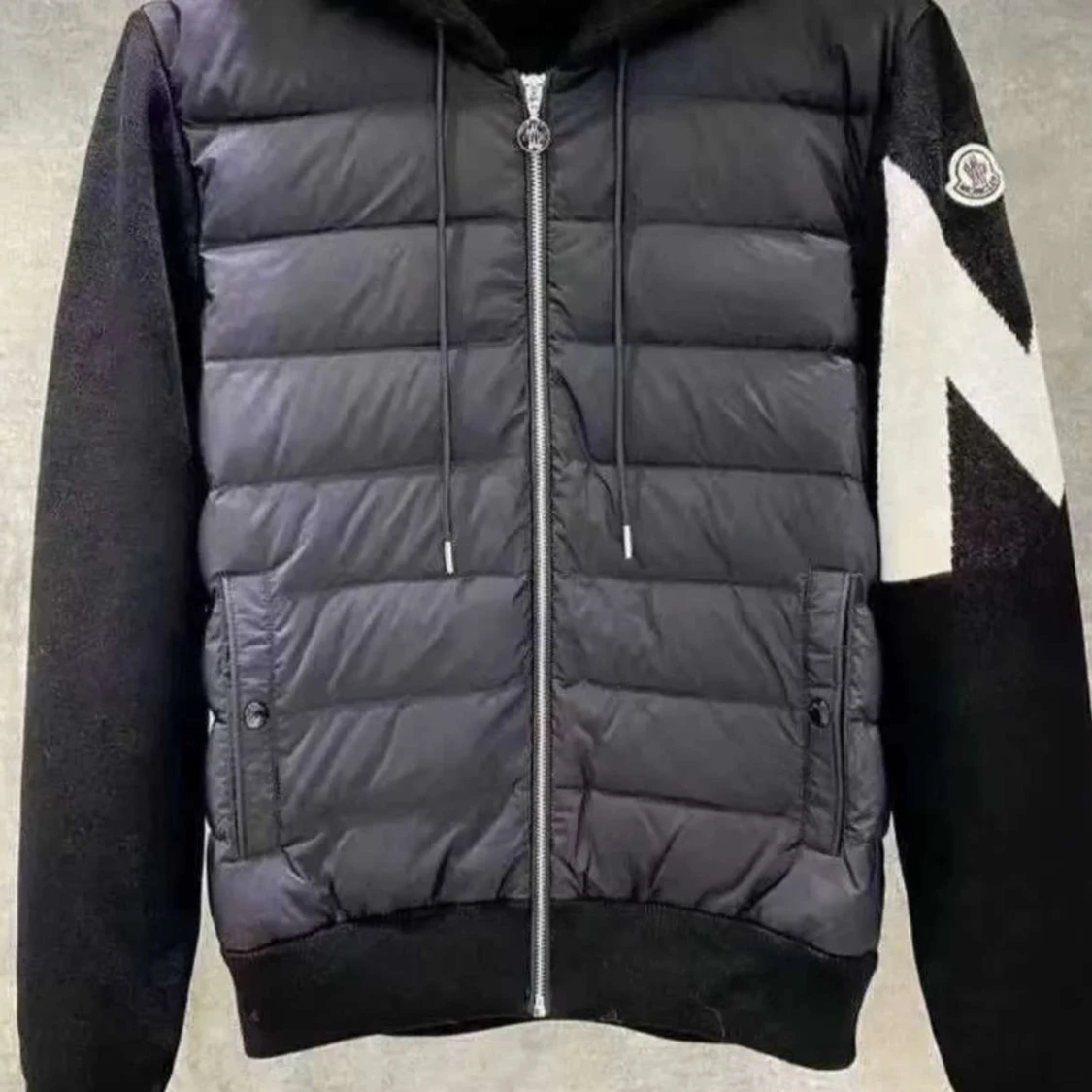 Snygg svart pufferjacka från Moncler med dragkedja och huva. Jackan har långa ärmar och ett stort vitt 'M' på ena ärmen. Perfekt för kyligare dagar.