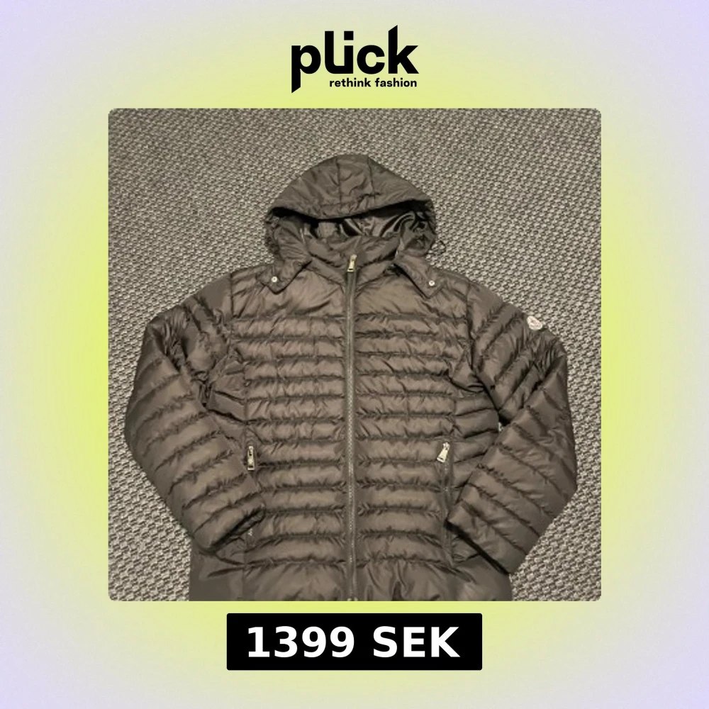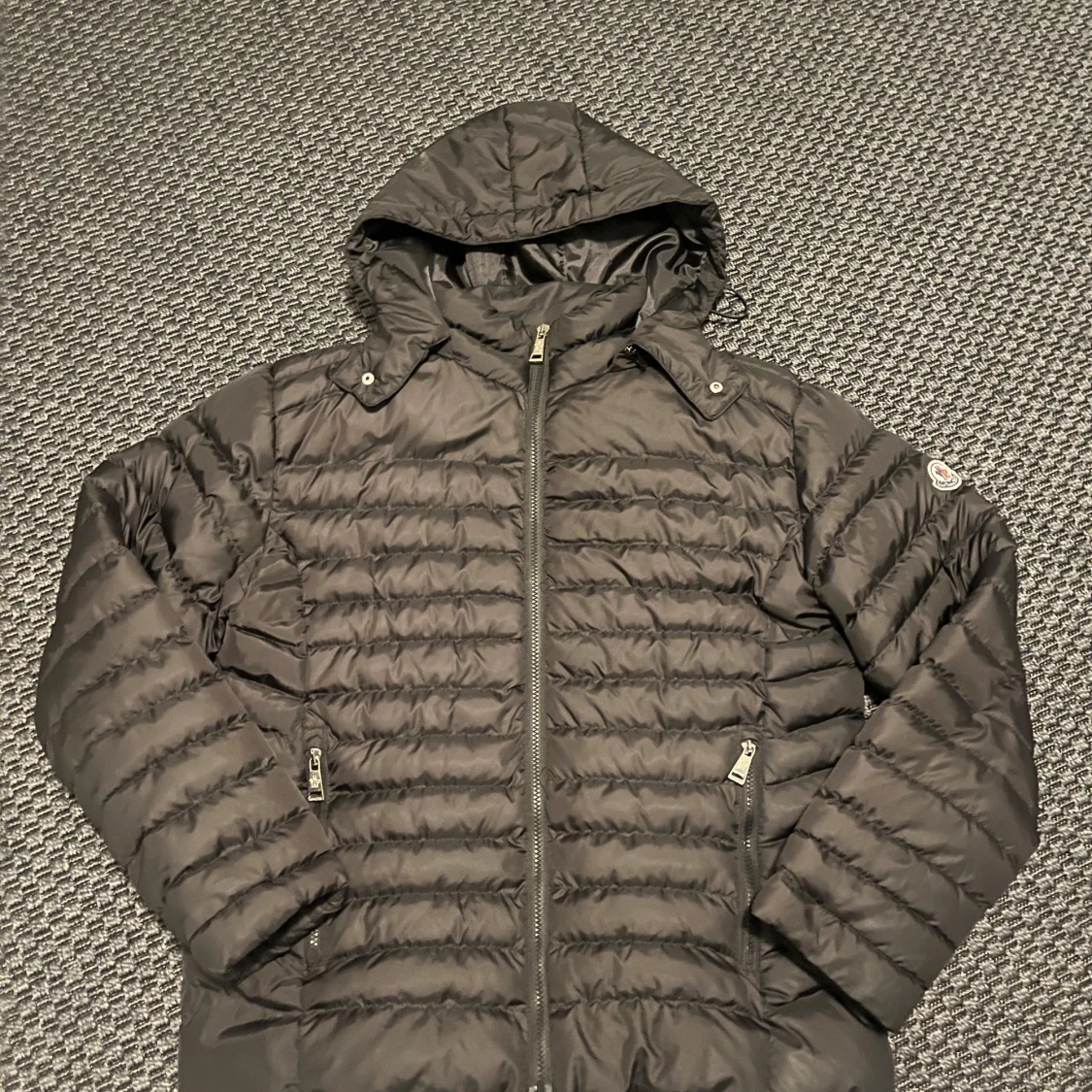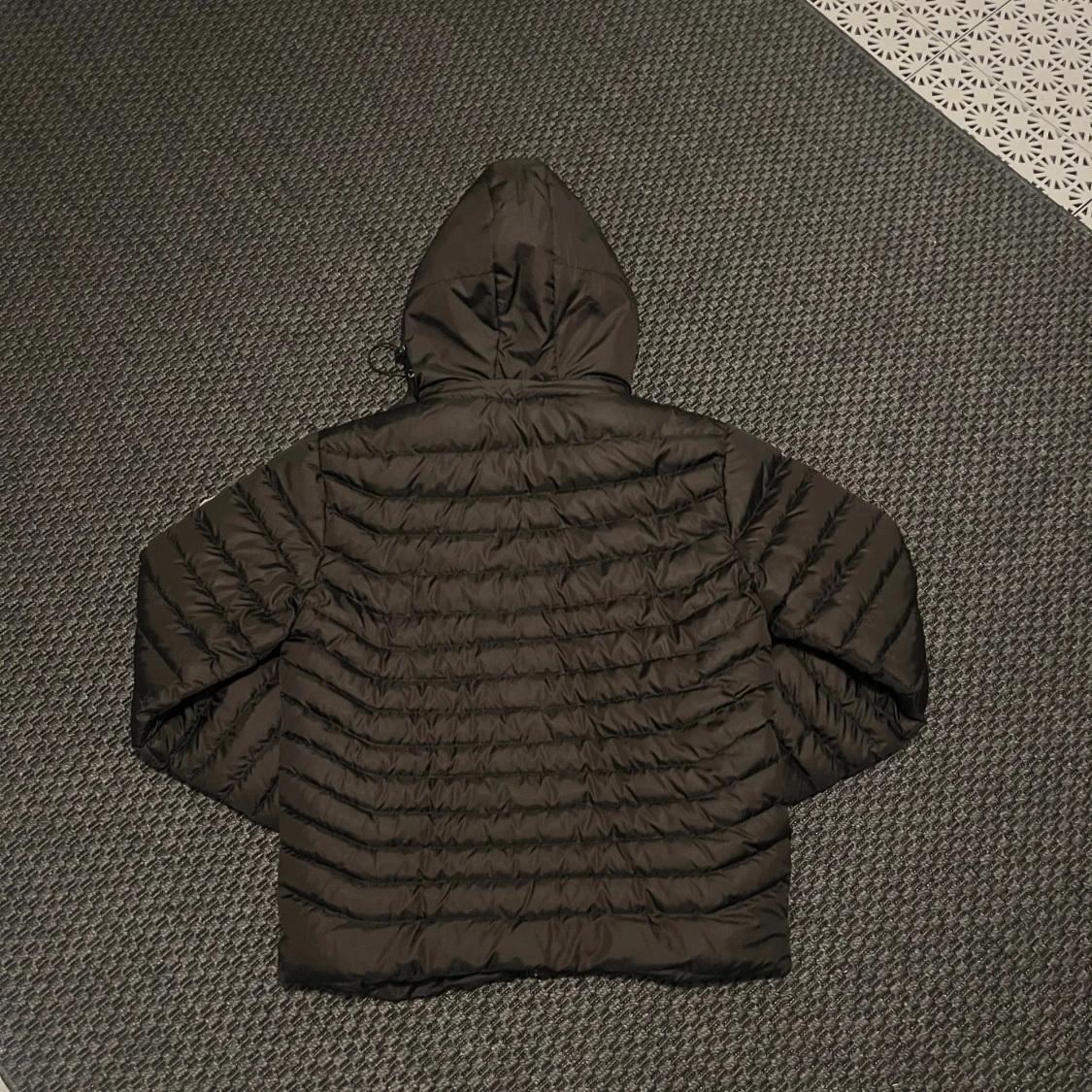 Säljer en svart dunjacka med avtagbar huva och dragkedja framtill. Perfekt för kalla dagar.