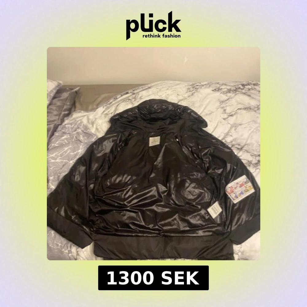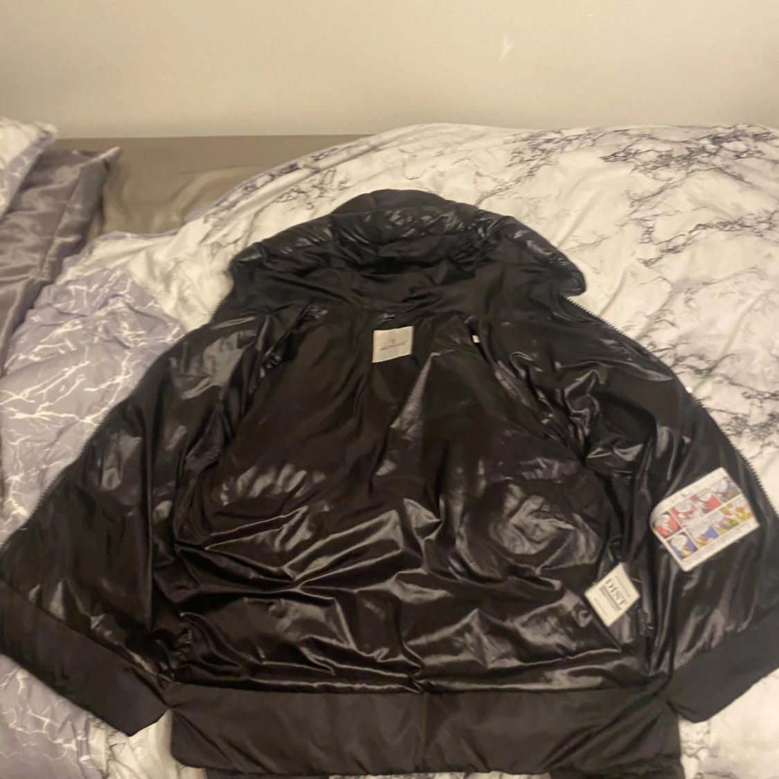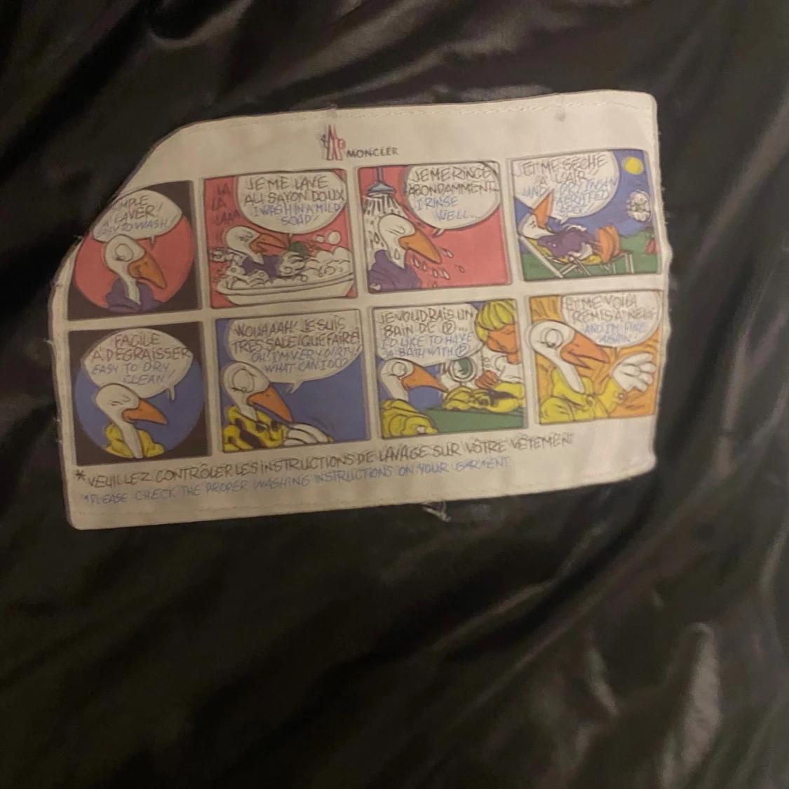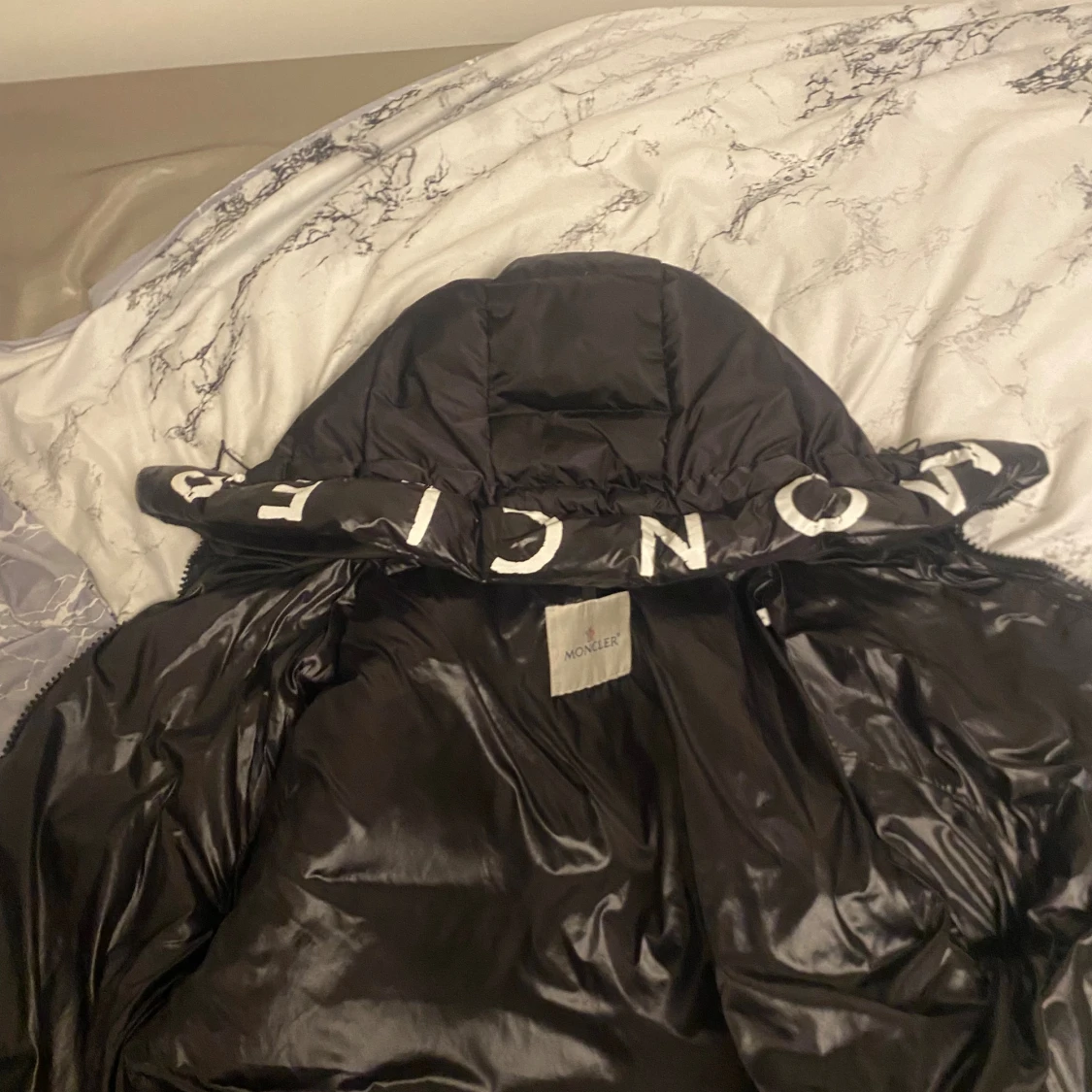 Säljer en svart pufferjacka från Moncler med glansig finish och stor huva där Moncler-loggan är tryckt i vitt. Jackan har dragkedja och coolt serietidningsmärke på insidan. Perfekt för dig som vill ha en varm och snygg vinterjacka med streetkänsla.