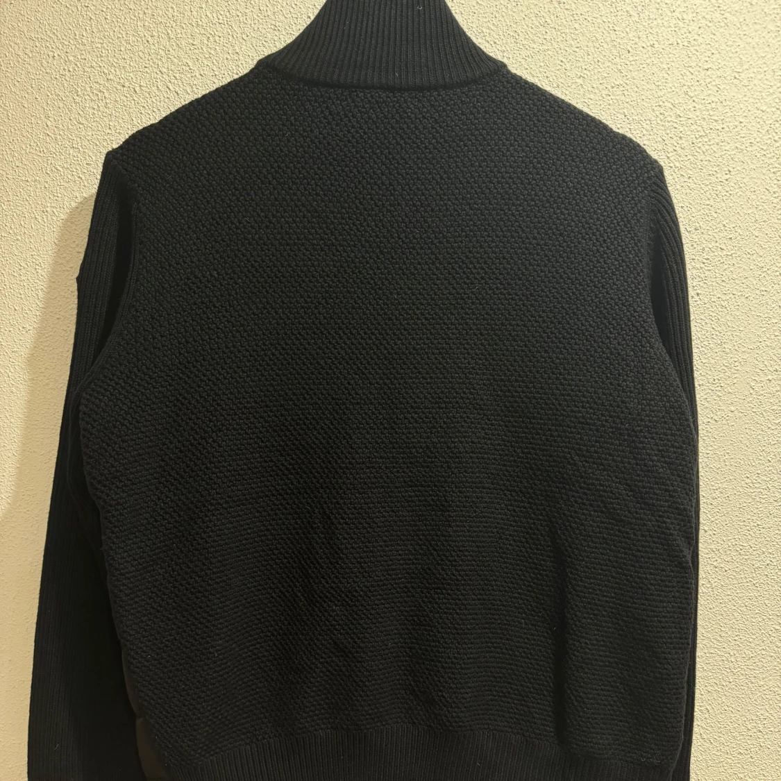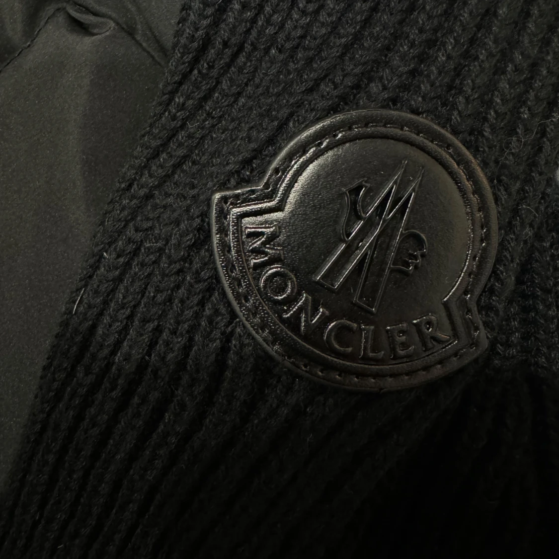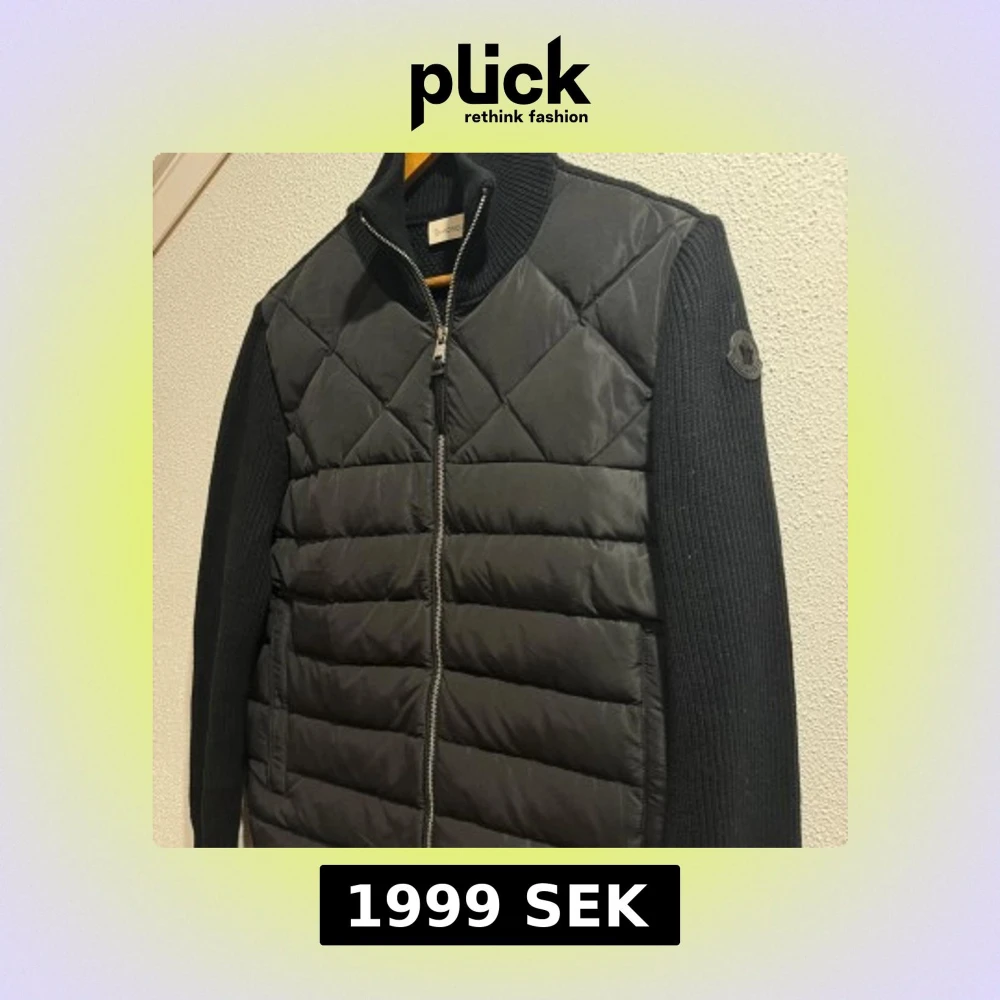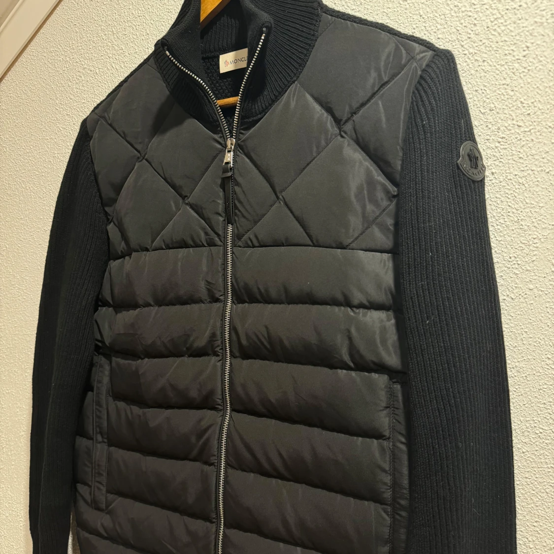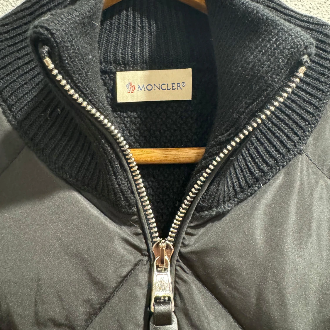Snygg svart quiltad jacka från Moncler med dragkedja och ribbad krage. Jackan har långa ärmar och en stilren design med Moncler-logga på ärmen. Perfekt för kyligare dagar.