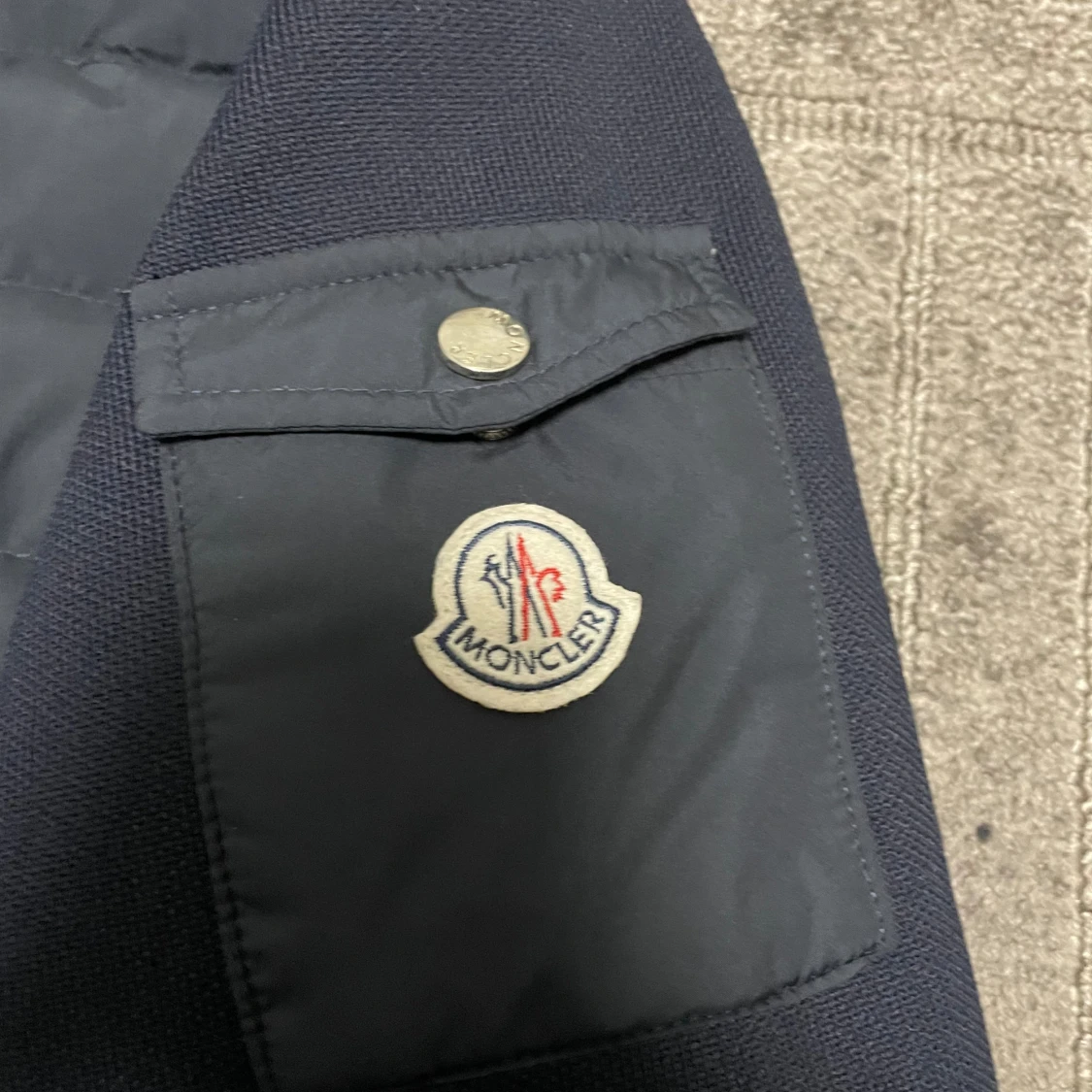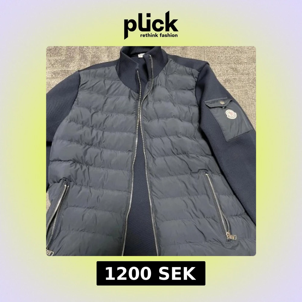 Säljer en mörkblå pufferjacka från Moncler med quiltad front, stickade ärmar och hög krage. Jackan har dragkedjor framtill och på fickorna samt en snygg Moncler-logga på ärmen. Perfekt för dig som vill ha en stilren och exklusiv look.