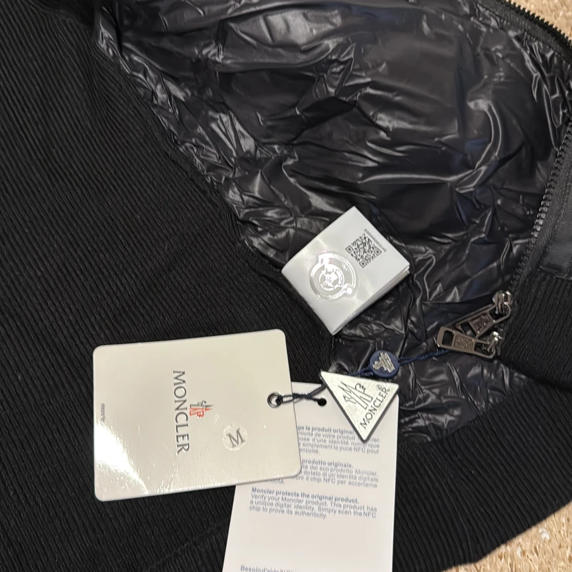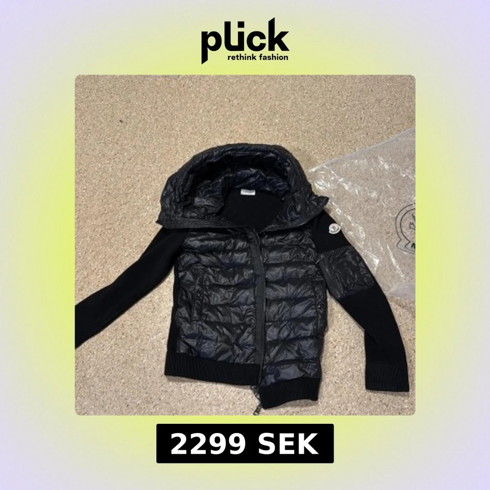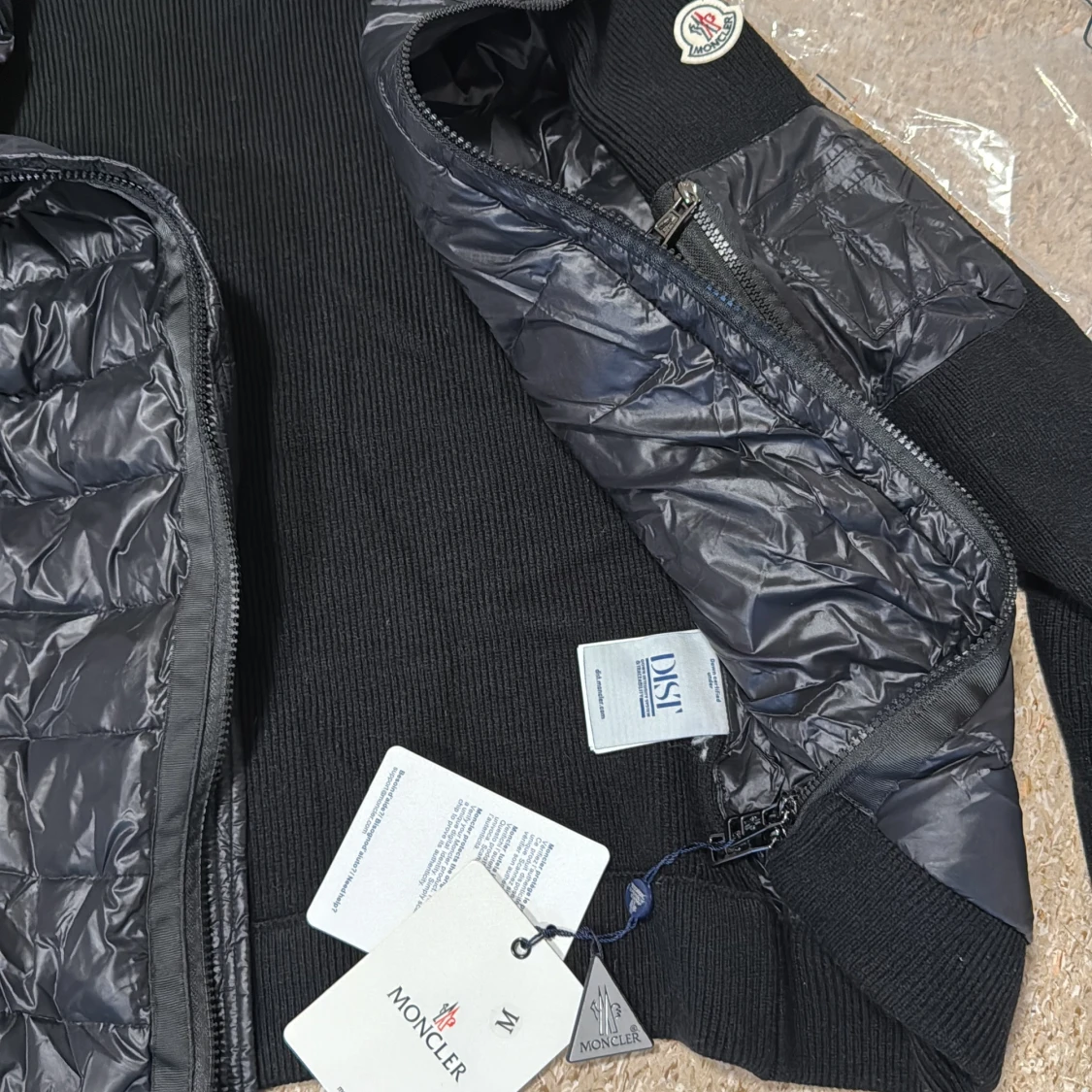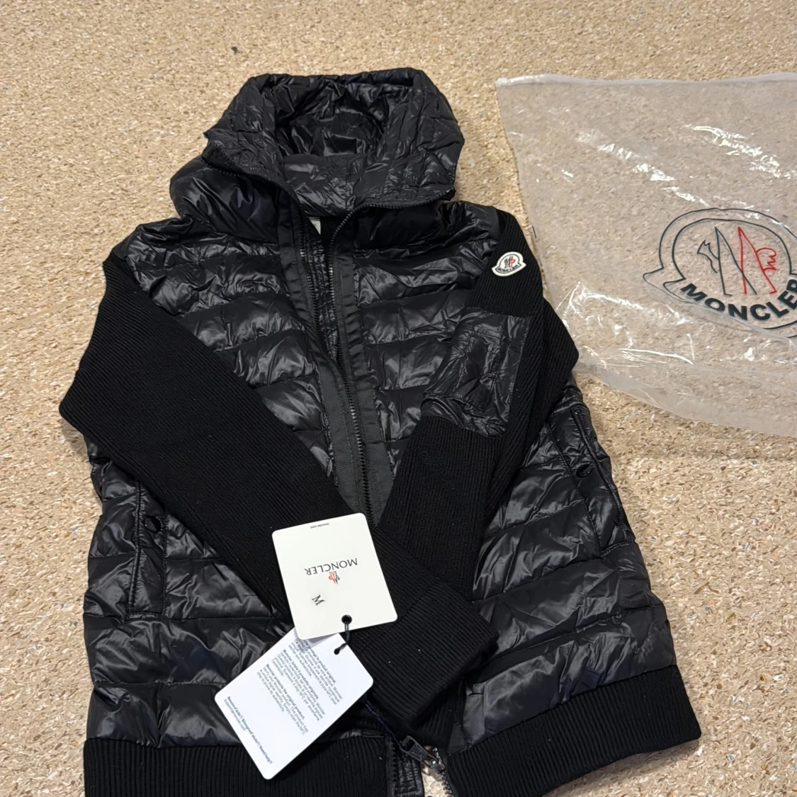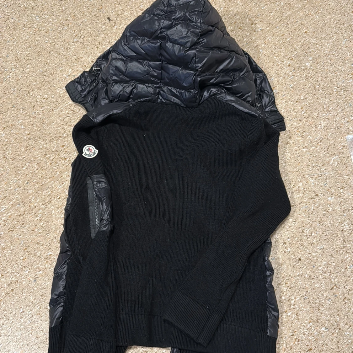 Svart pufferjacka från Moncler med stickade ärmar och quiltad front. Jackan har en stor huva, dragkedja framtill och Moncler-logga på ärmen. Materialmix av polyester och stickad textil ger en cool kontrast. Perfekt för dig som gillar streetstyle och exklusiva märken.