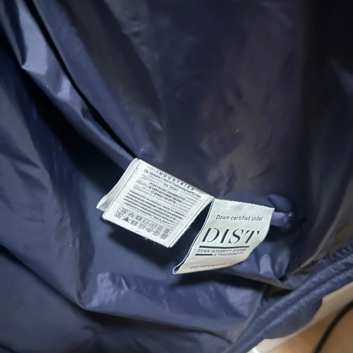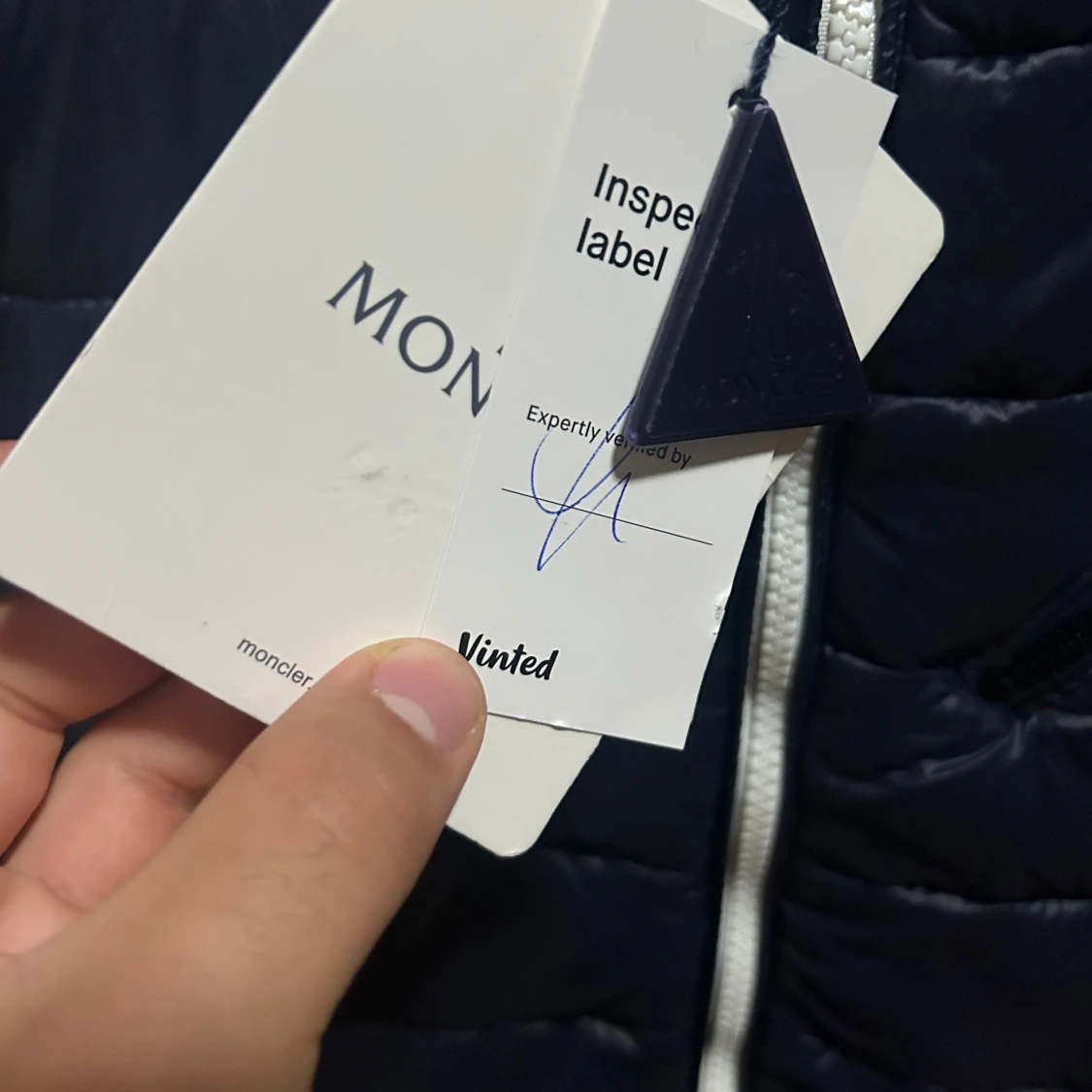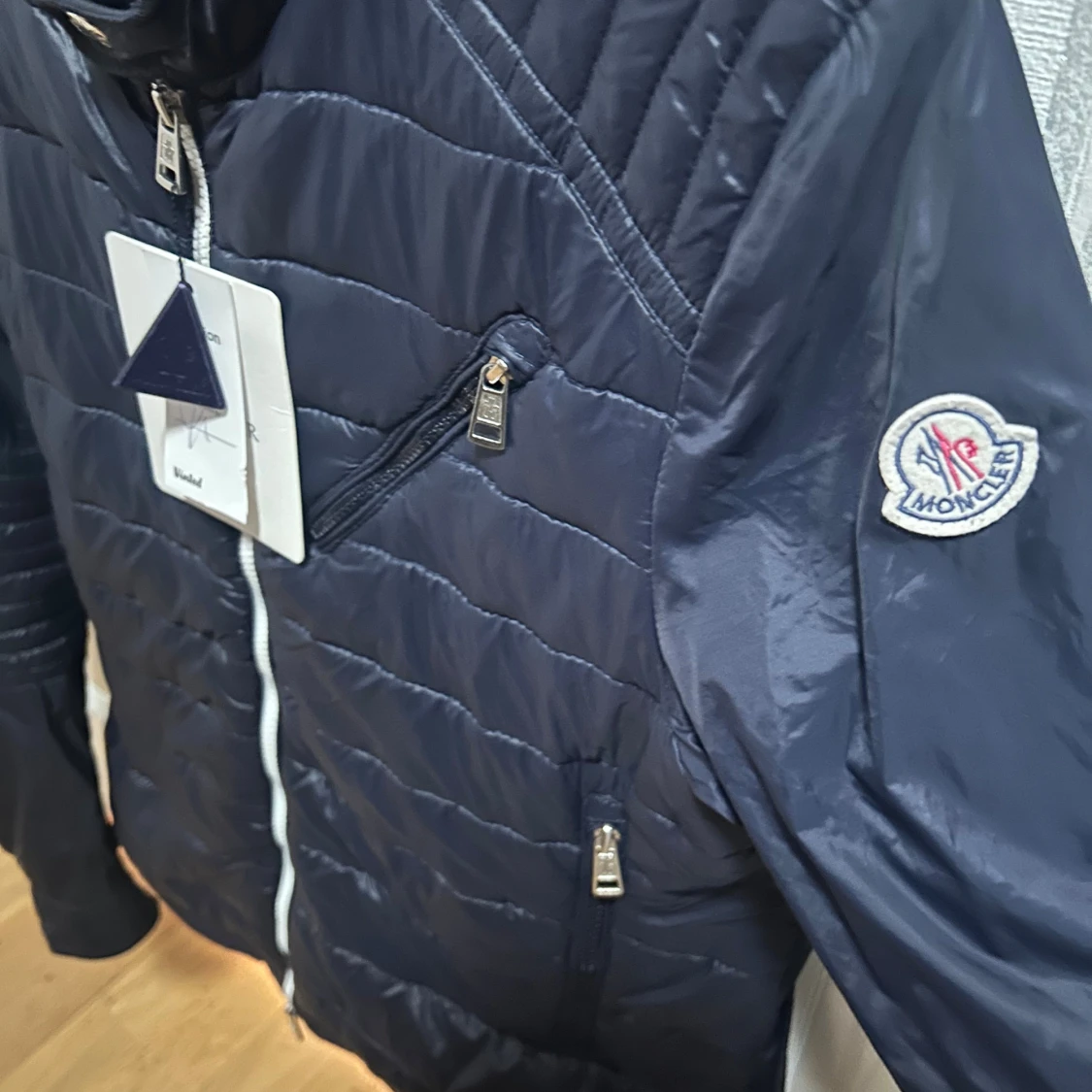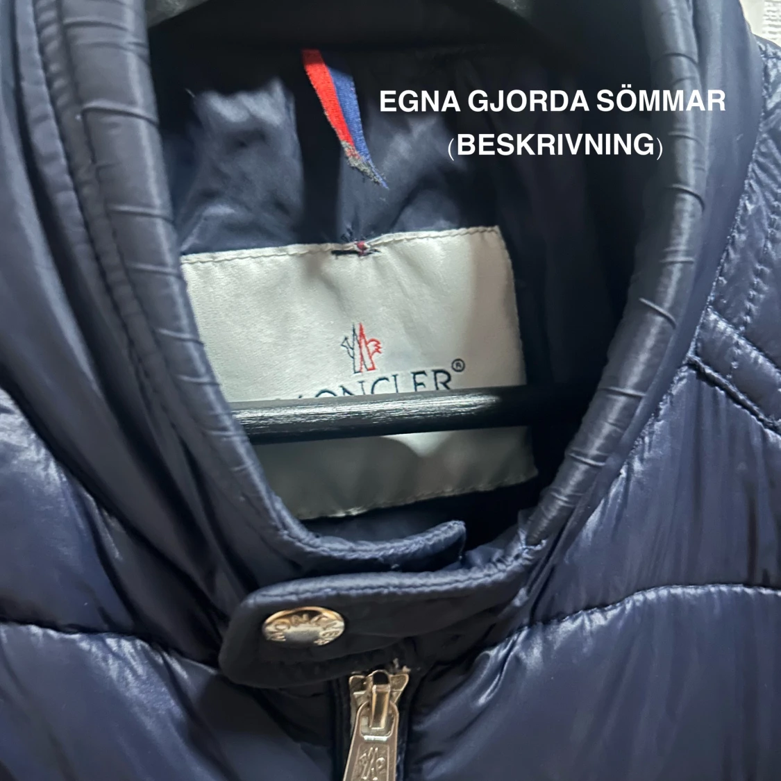 OBS: Jackan är ett tag gammal och har 2 defekter, Nr 1, inner ”Moncler” taggen revs av därför är den nu påsydd med nya sömmar (Bild 5). Nr 2, en bit av inner storleks taggen har också rivits av. Snygg mörkblå dunjacka från Moncler med quiltad design och vita detaljer vid dragkedjan. Jackan har flera dragkedjeförsedda fickor, lång ärm och klassisk Moncler-logga på ärmen. Perfekt för dig som vill ha en stilren och lätt jacka med exklusiv känsla.