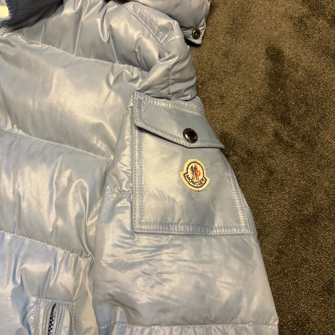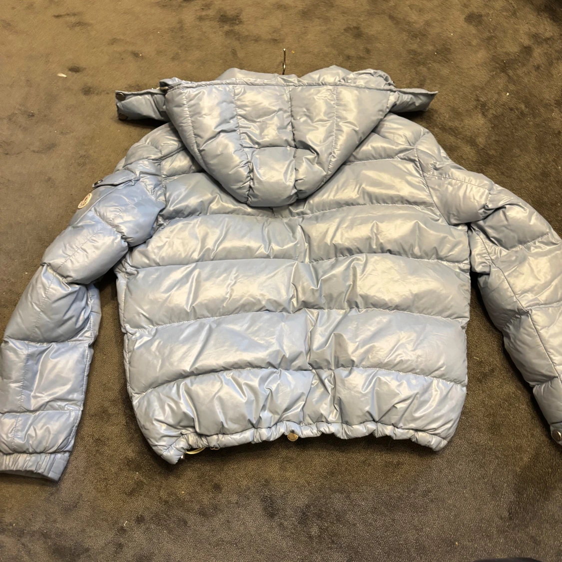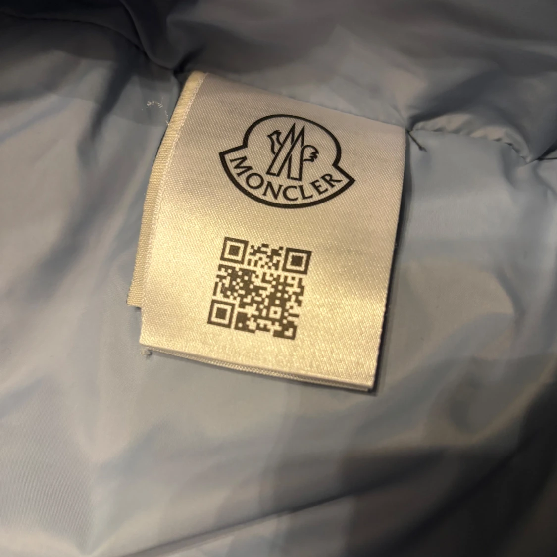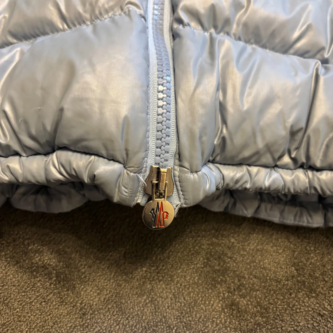Säljer en ljusblå pufferjacka från Moncler med huva och dragkedja framtill. Jackan har två fickor med dragkedja, en ärmficka med Moncler-logga och quiltad design. Perfekt för kalla dagar och riktigt snygg till streetwear. Den är äkta!! Priset är för handlings bart vid snabb affär