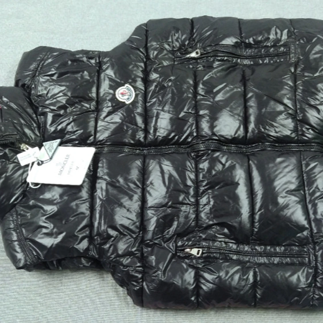 Snygg svart dunväst från Moncler med glansig yta och dragkedjor på fickorna. Perfekt för kyligare dagar och ger en stilren look. Västen har en broderad logga på bröstet.