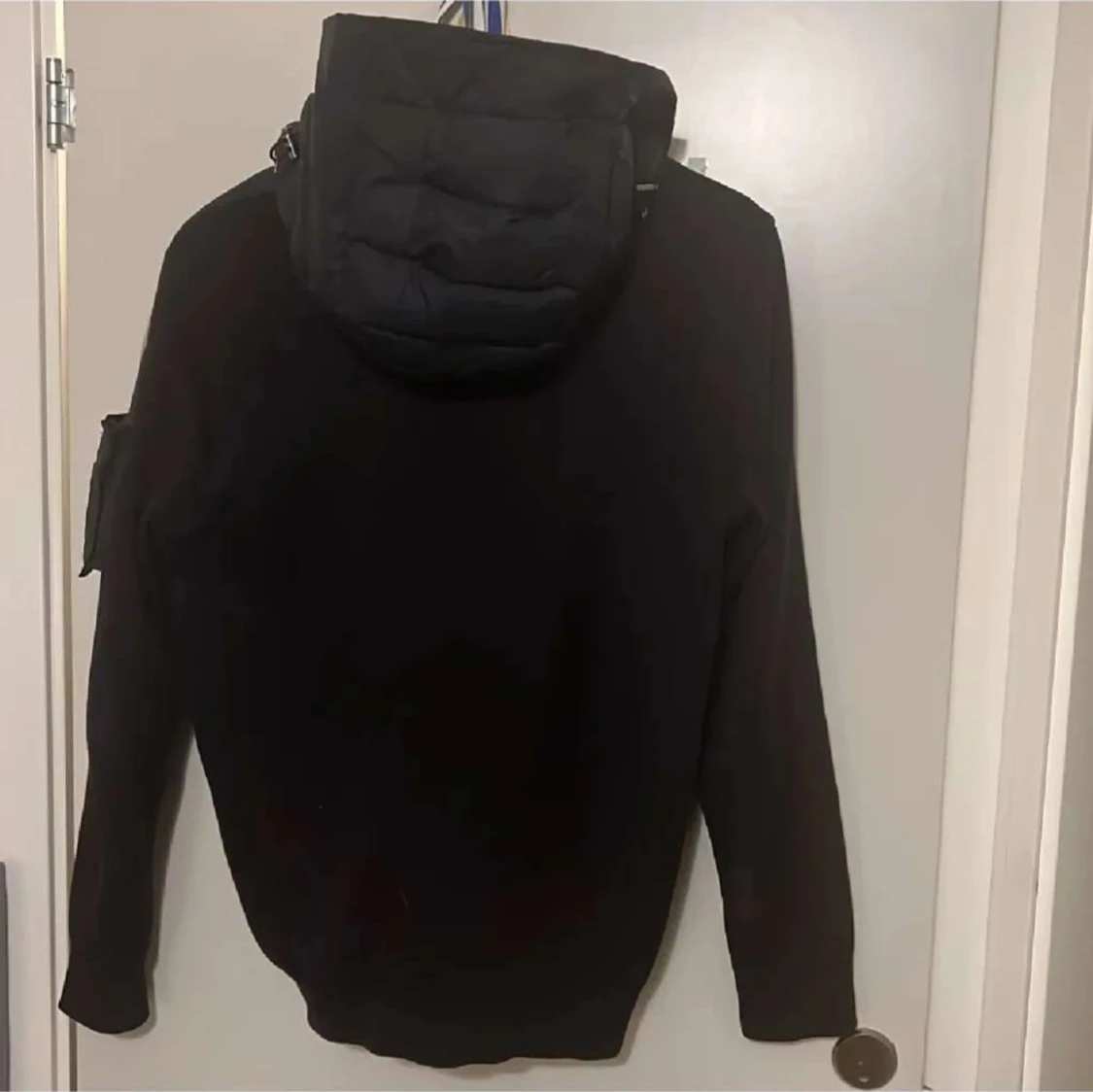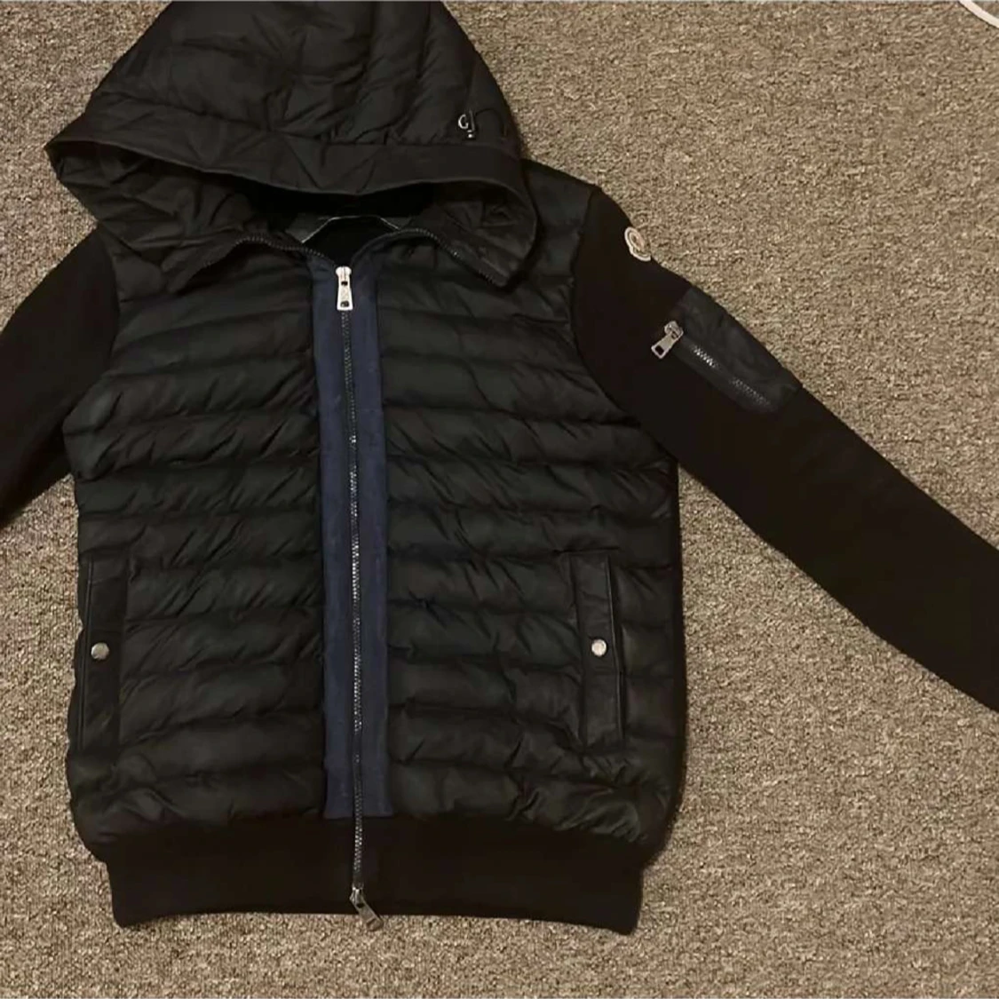 Snygg svart pufferjacka från Moncler med quiltad framsida, huva och långa ärmar. Jackan har dragkedja framtill, fickor med tryckknappar och en extra ficka med dragkedja på ärmen. Perfekt för dig som vill ha en stilren och sportig look.