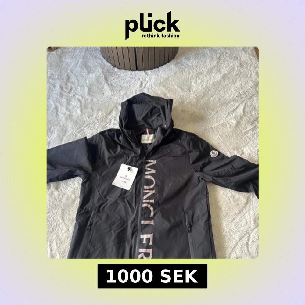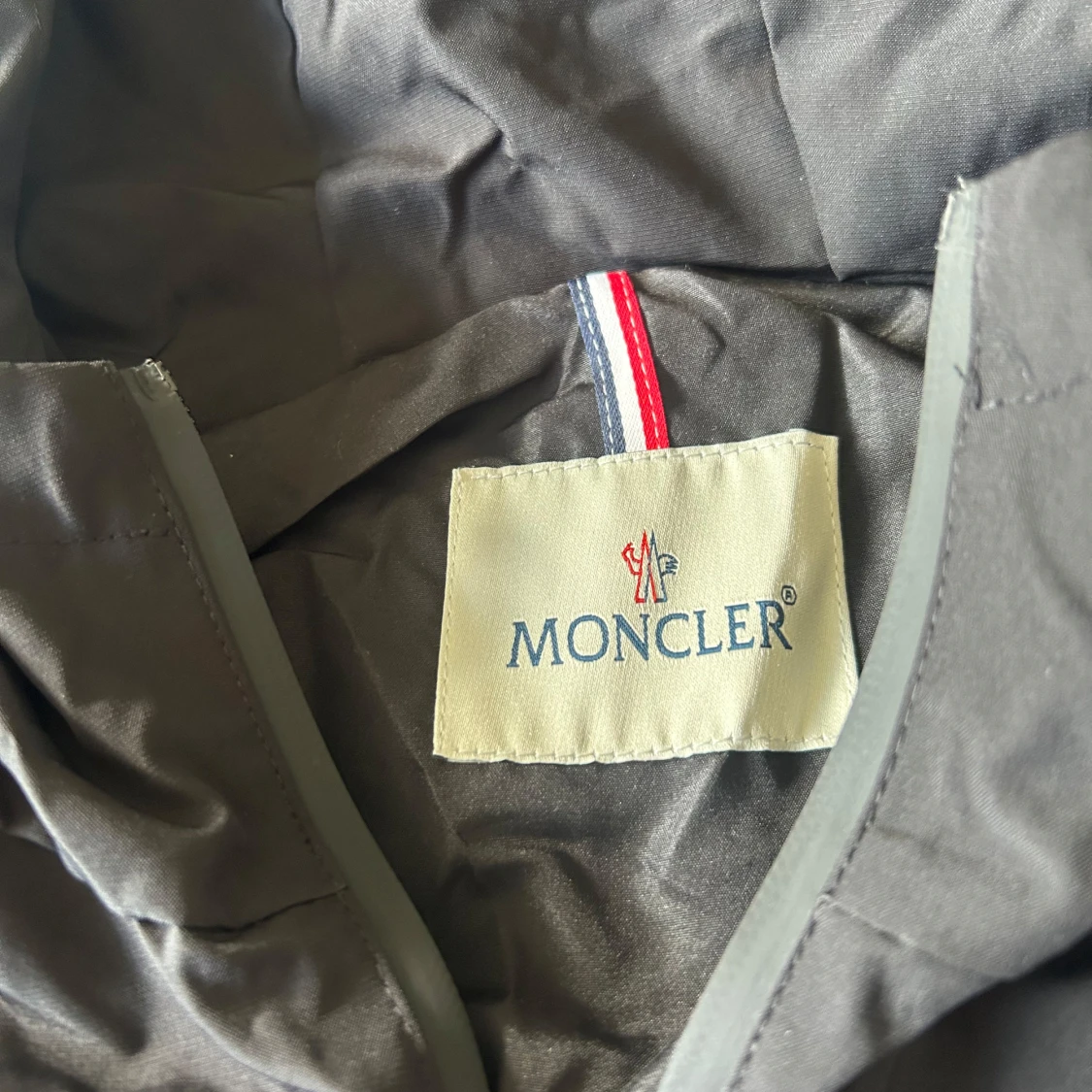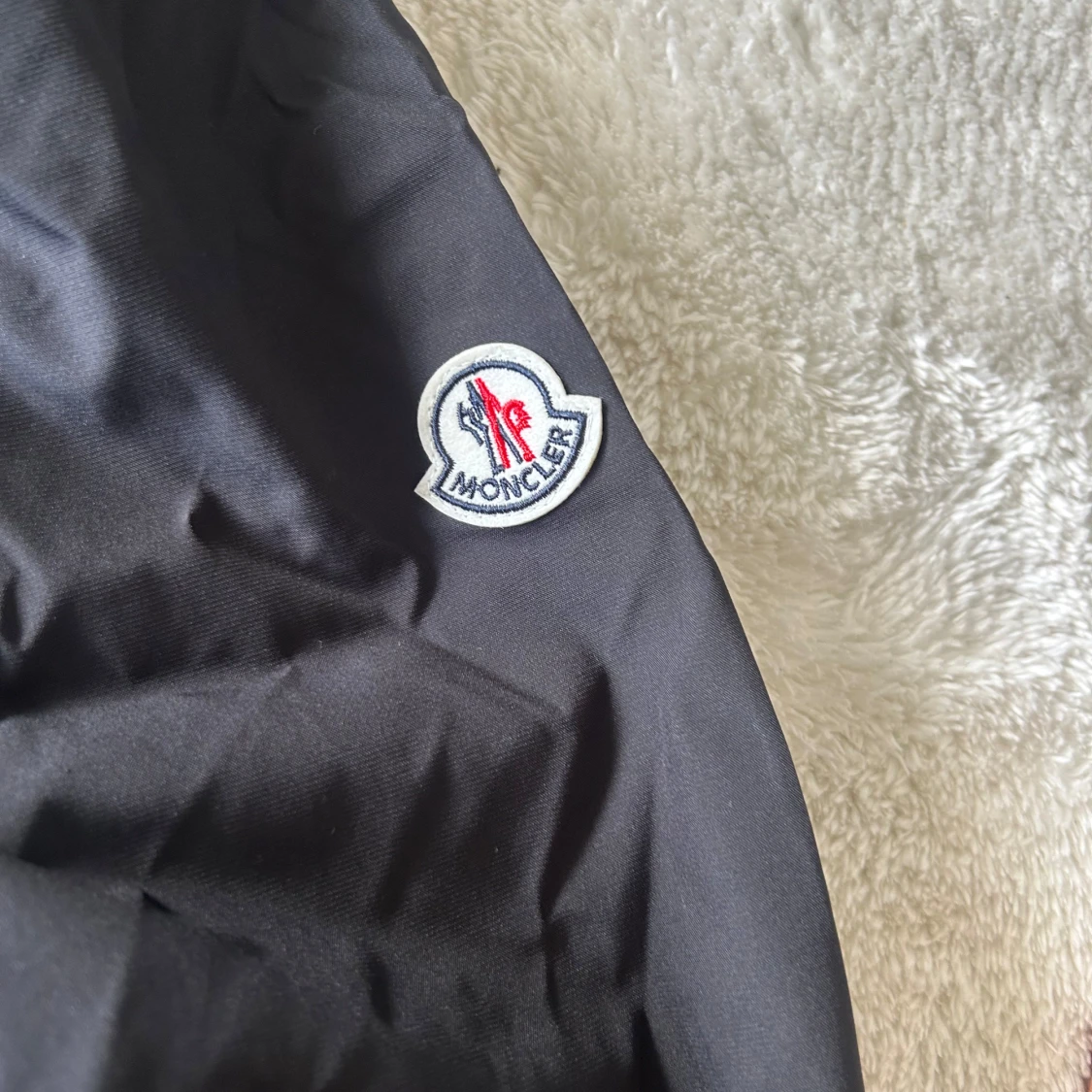 Svart vindjacka från Moncler med stor logotyp tryckt längs dragkedjan och klassisk Moncler-patch på ärmen. Jackan har huva, två sidofickor med dragkedja och snygga detaljer. Perfekt för dig som gillar stilrena och sportiga plagg.