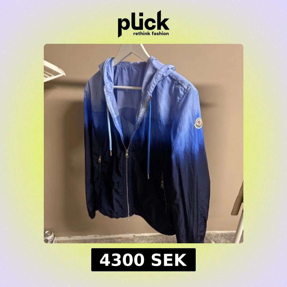 Säljer en snygg blå vindjacka från Moncler med gradient från ljusblått till mörkblått. Jackan har huva med dragsko, dragkedja framtill och Moncler-logga på ärmen. Perfekt för dig som vill ha en stilren och lätt jacka. Skriv även om ni har ett prisförslag till mig