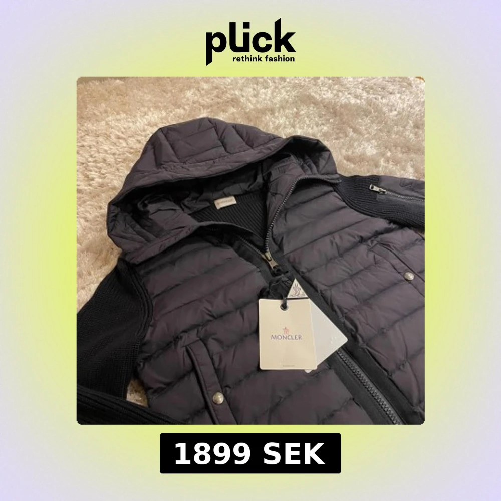Snygg mörkblå moncler cardigan med stickade ärmar och quiltad framsida. Västen har en stor huva, dragkedja framtill, ribbade muddar och Moncler-logga på ärmen. Perfekt för lager-på-lager och streetstyle. Loggan skannar. Säljs på grund av att den var för liten