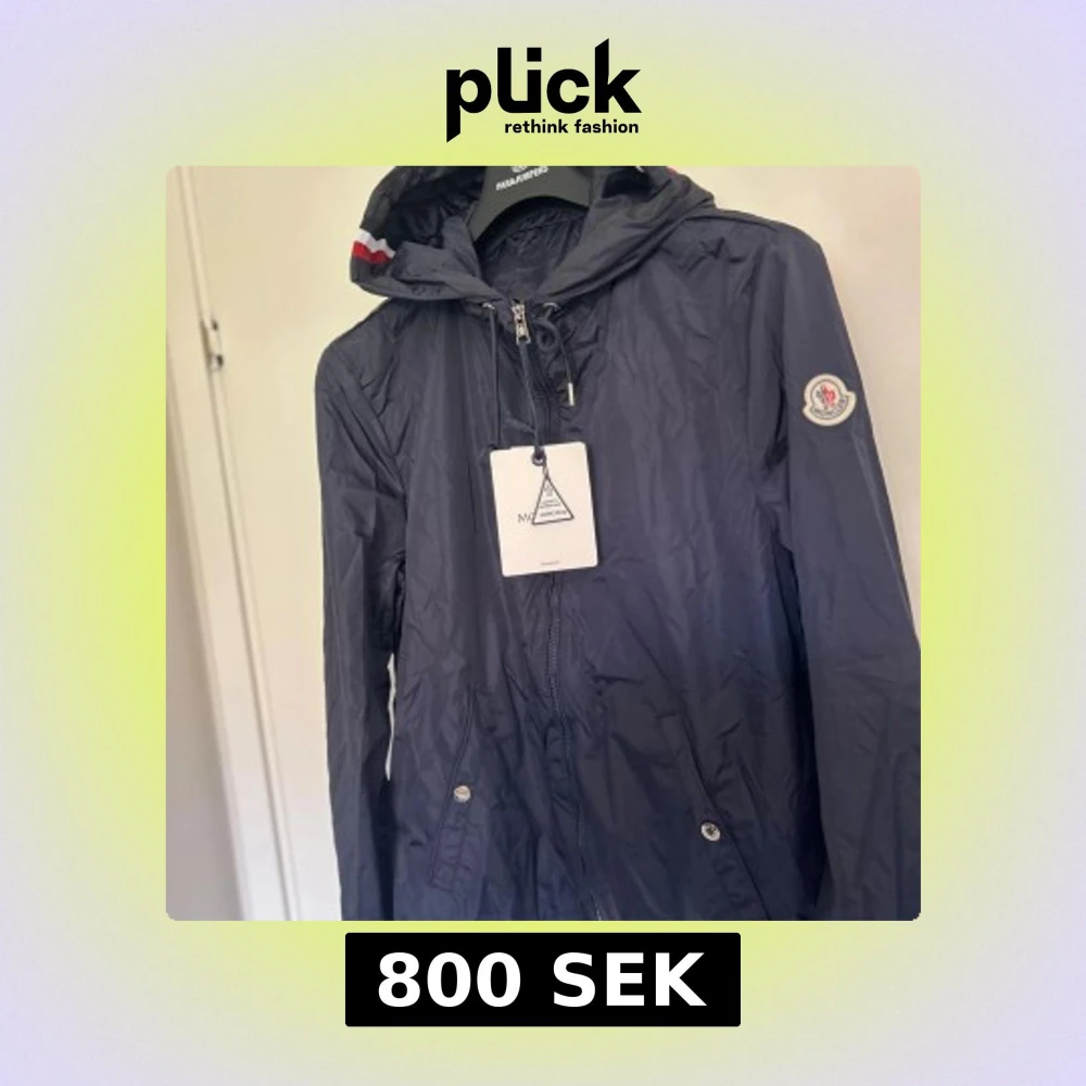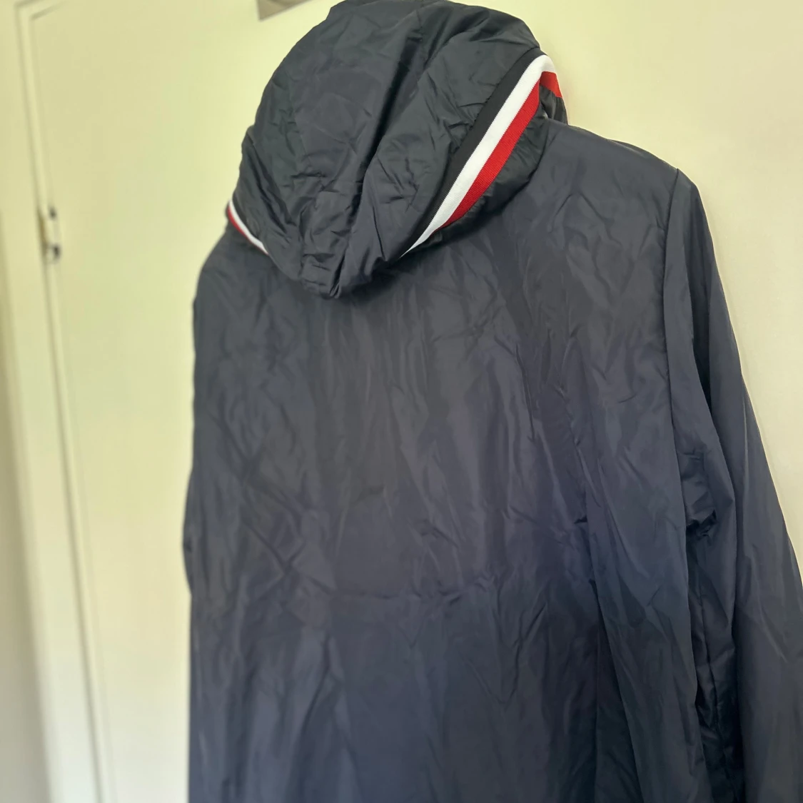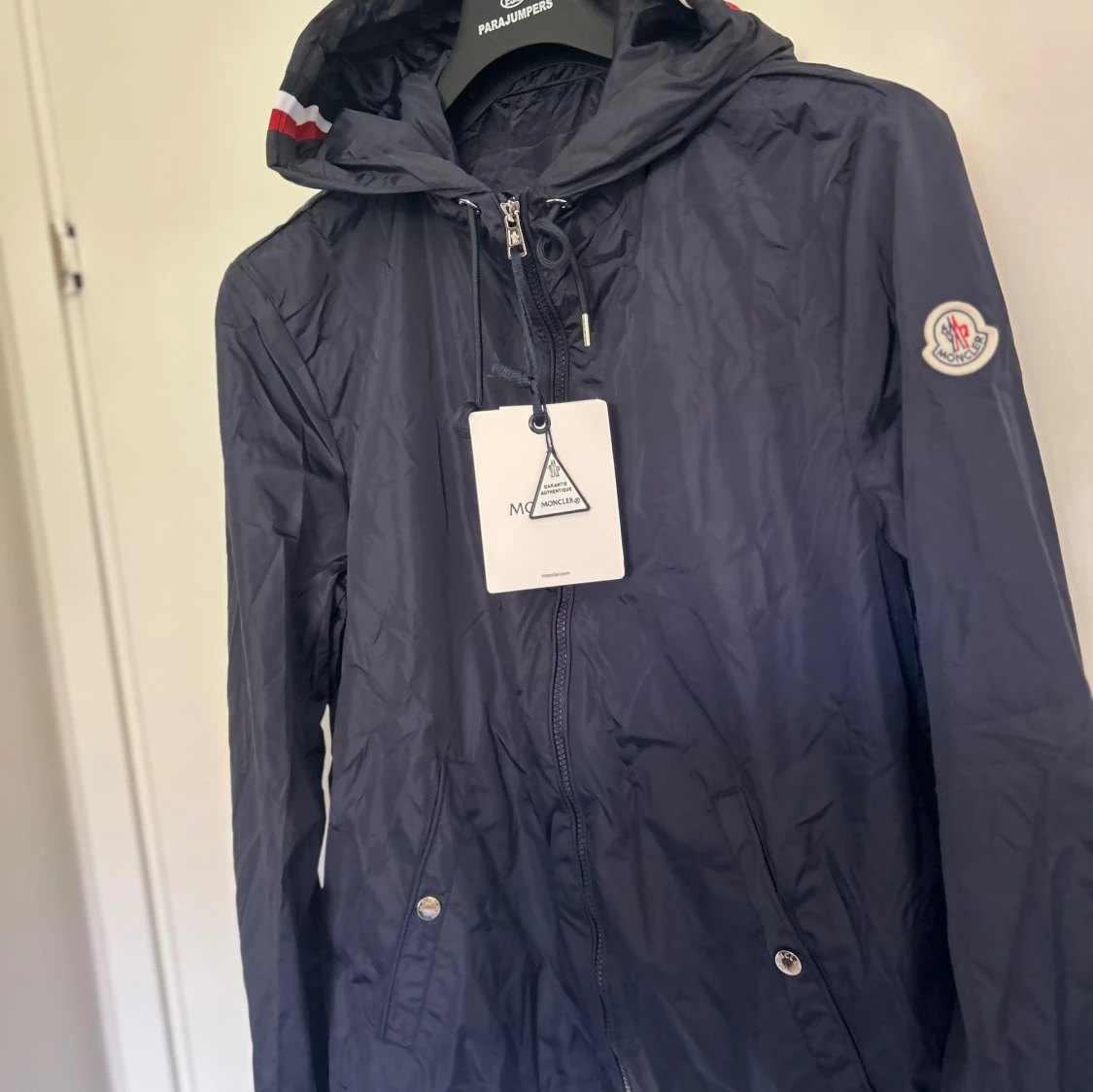 Snygg marinblå vindjacka från Moncler med huva och dragkedja framtill. Jackan har Moncler-logga på ärmen och coola rödvita detaljer på huvan. Lätt och smidig design i syntetmaterial, perfekt för blåsiga dagar. Fickor med tryckknappar och justerbar huva.