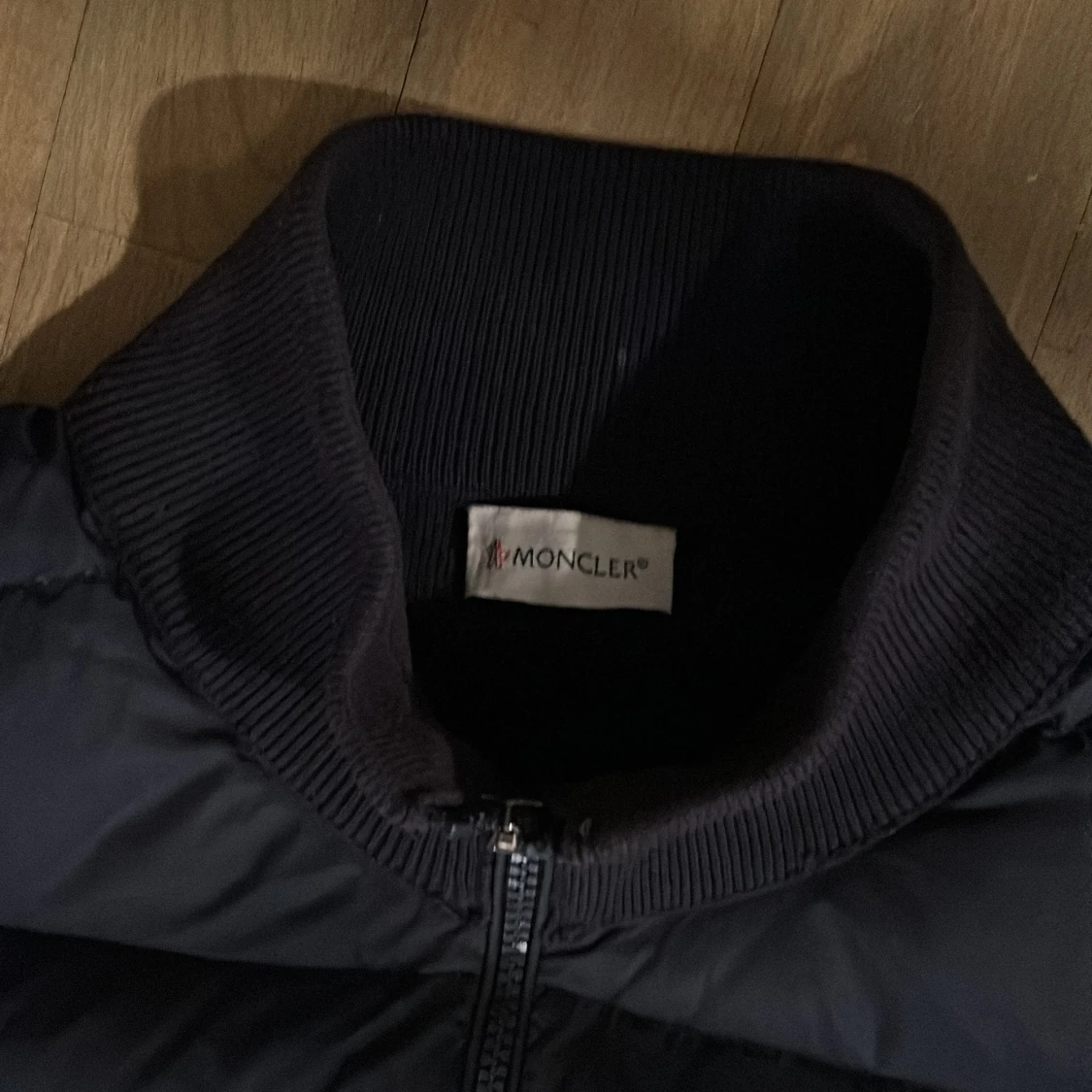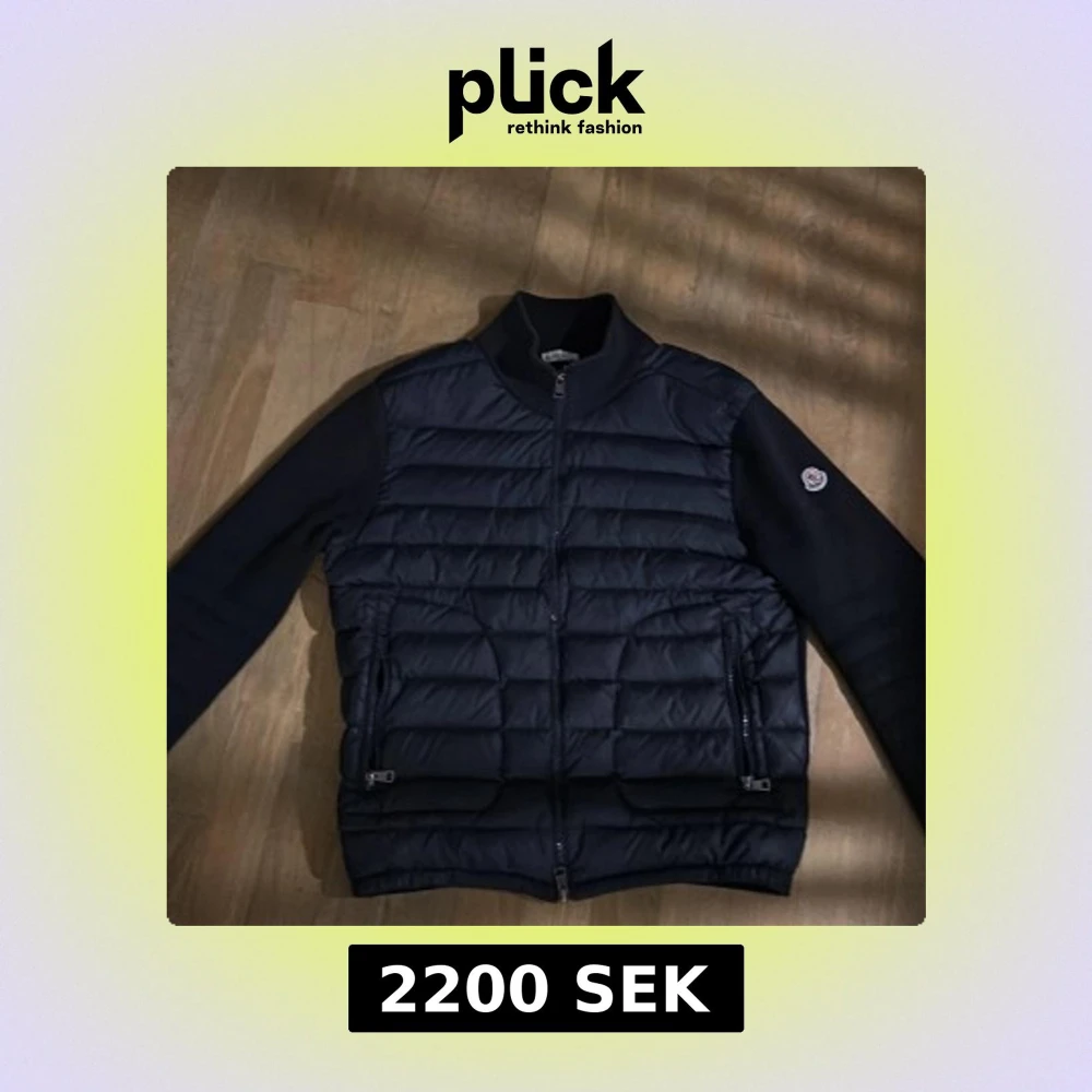 Snygg svart pufferjacka från Moncler med dragkedja och ribbad krage. Jackan har långa ärmar och ett stilrent märke på ärmen. Är storlek M men känns mer som S