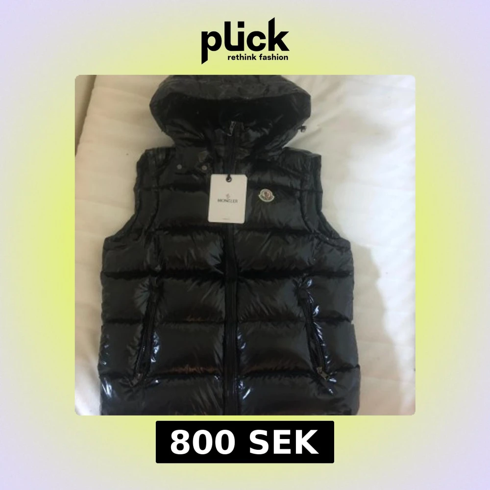 Säljer en glansig svart dunväst från Moncler med avtagbar huva och dragkedja framtill. Västen har två fickor med dragkedja och ikonisk Moncler-logga på bröstet. Insidan har ett coolt serietryck och Moncler-märke. Perfekt för lager-på-lager-stil.