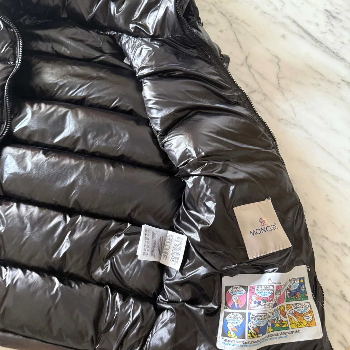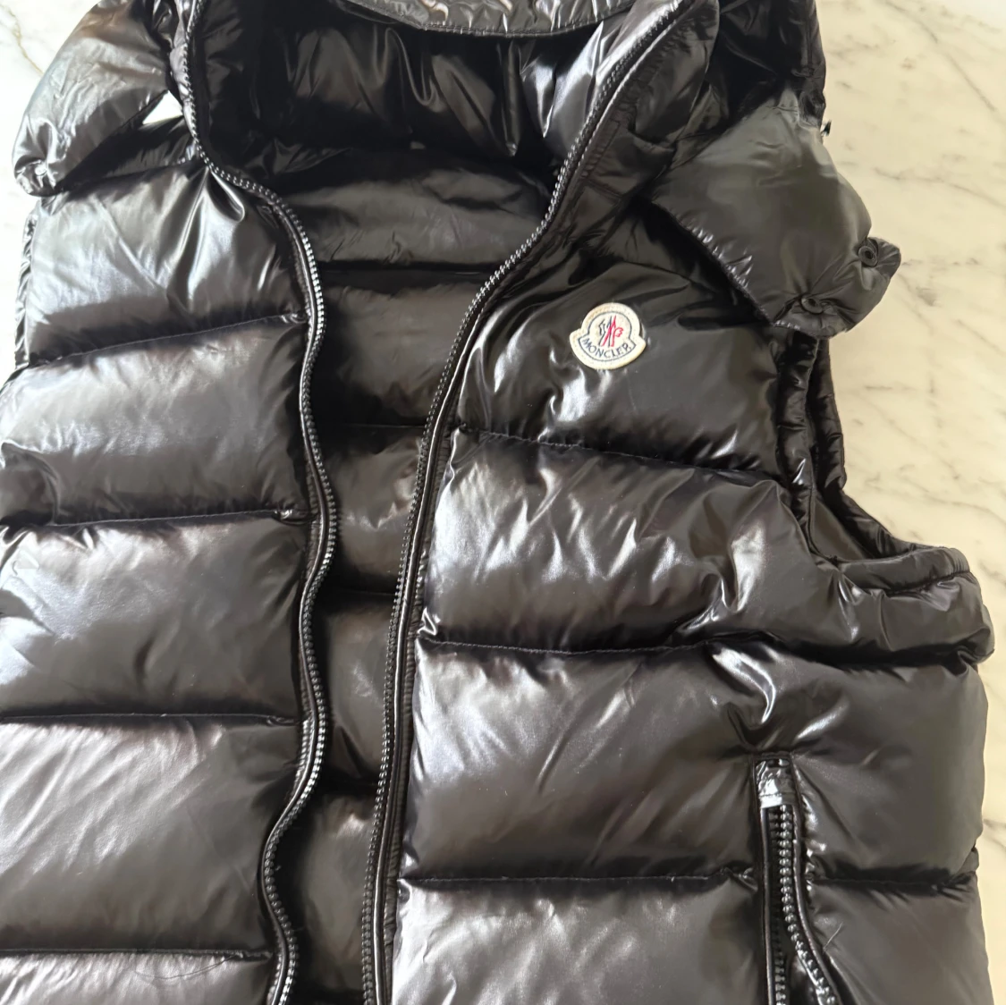 Svart, glansig dunväst från Moncler med hög krage och två dragkedjefickor framtill. Västen har quiltad design, Moncler-logga på bröstet och innerfoder med serietidningsmönster. Perfekt för lager-på-lager och streetstyle.