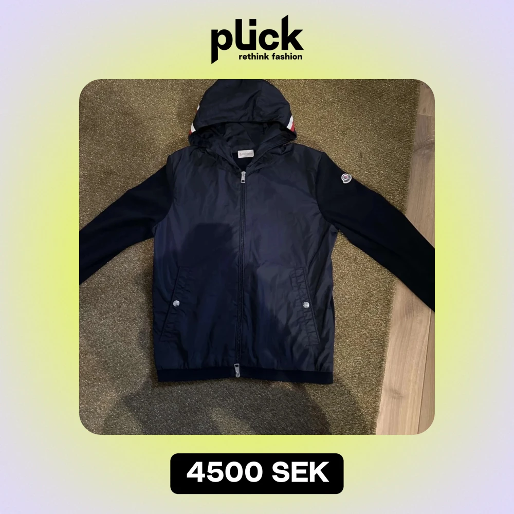 Säljer en snygg svart vindjacka från Moncler. Den har en dragkedja framtill och en praktisk huva. Jackan är perfekt för höst och vår, med långa ärmar och en stilren design. Två fickor med knappar på sidorna ger extra funktionalitet. Passar perfekt för både vardag och lite finare tillfällen. Storlek M fast passar som S